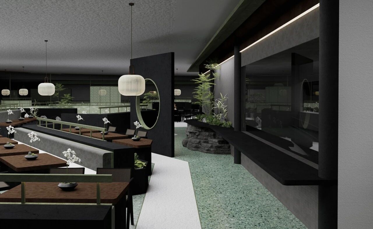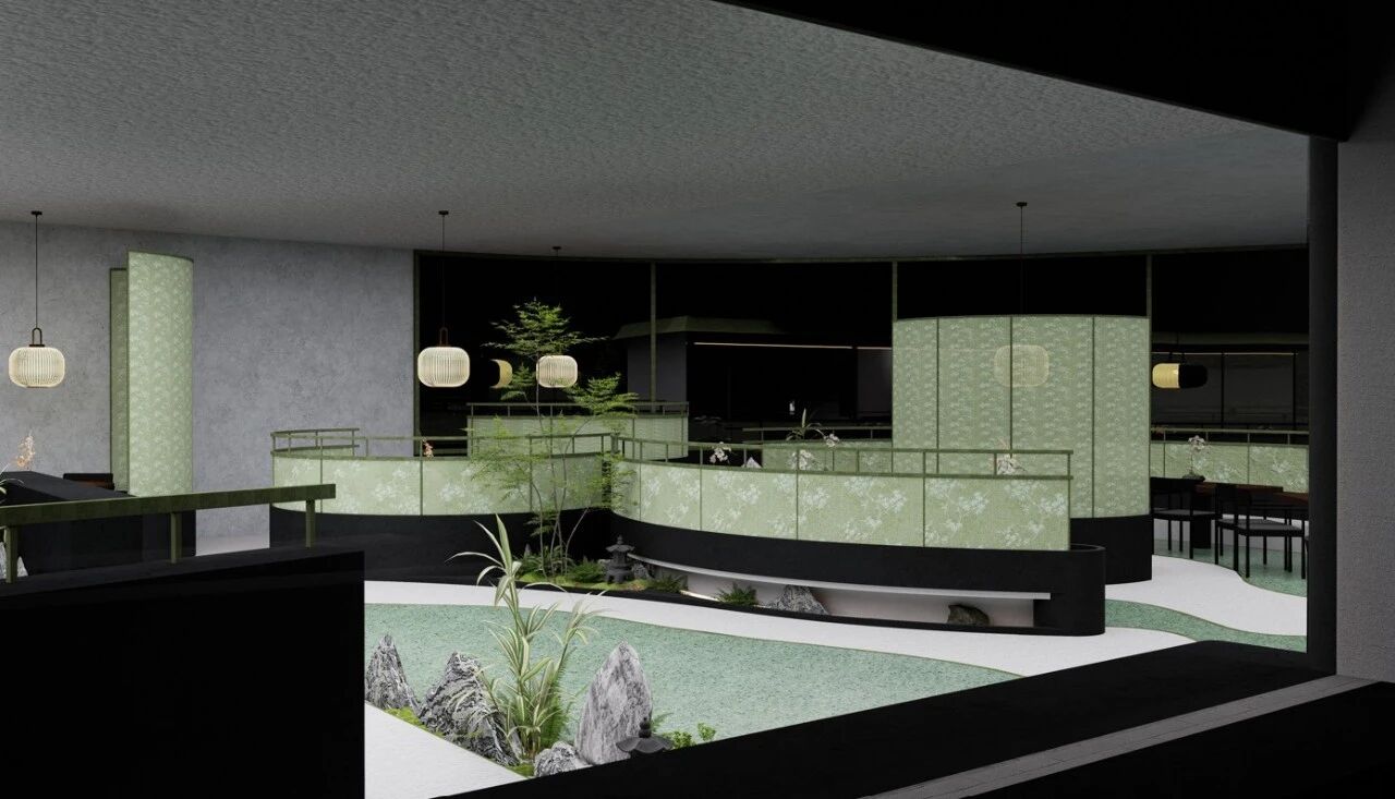 将区域划分成“山、水、屋、林”几个部分,通过这种分区方式,我们让餐厅不再只是供餐空间,而是让“选择座位”也成为体验的一部分。游客能在“曲折、狭窄、开阔”之间切换,像在园林中游走。