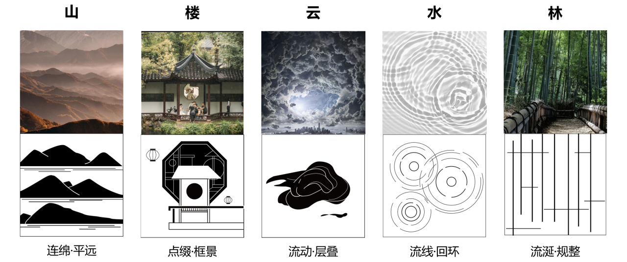 意象被拆分为四类:山、楼、云、水、林——它们不是简单的装饰,而是对应着“场景氛围与行为体验”的变化。