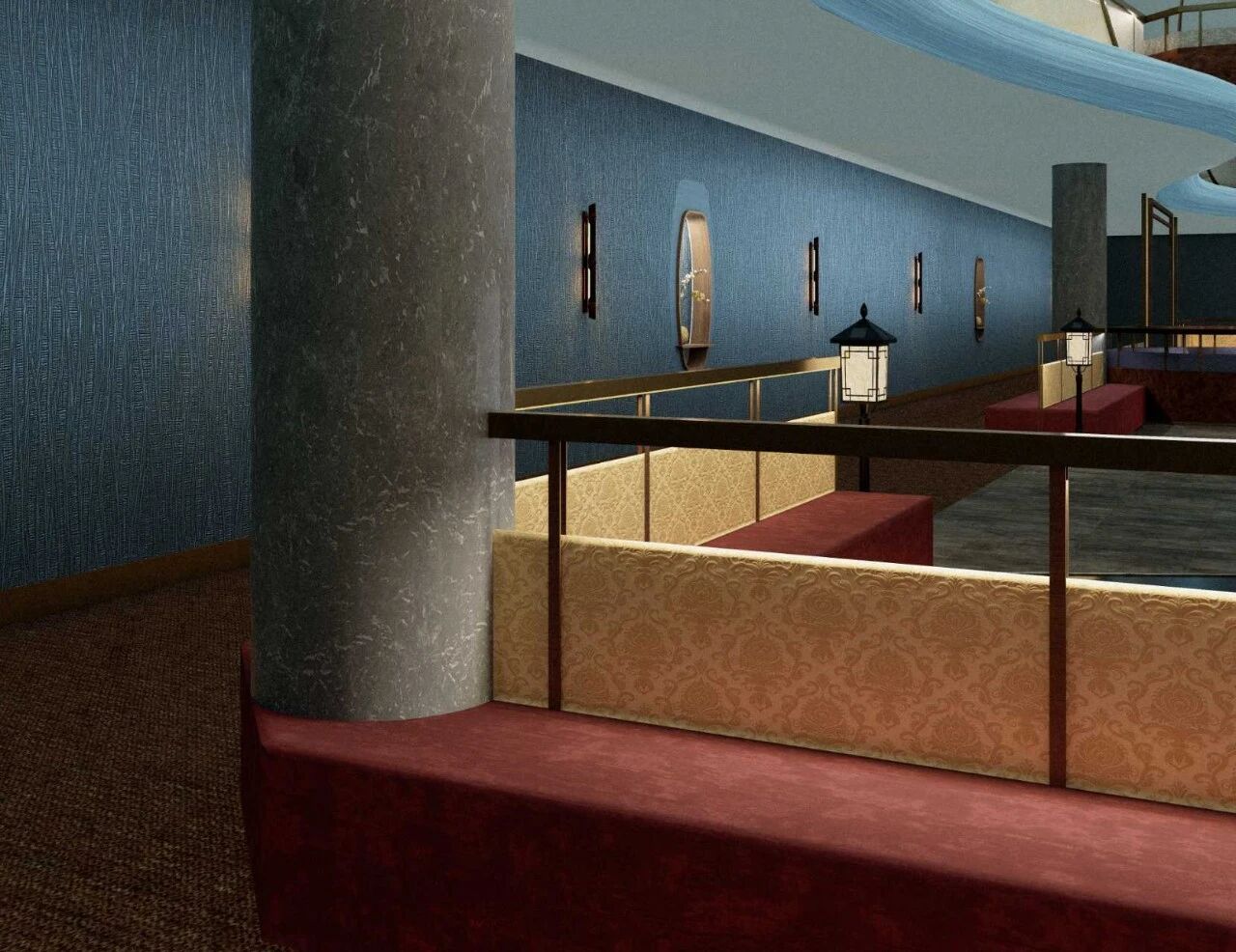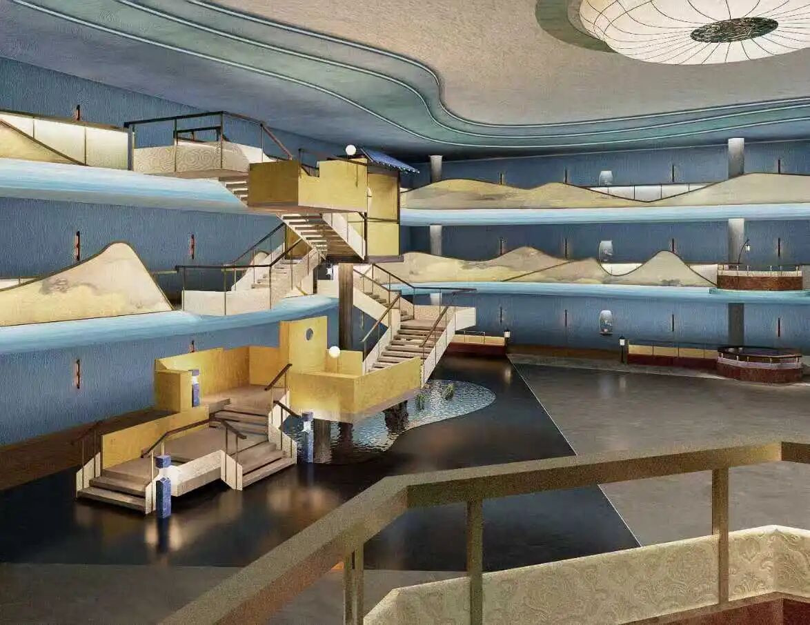设计理念源自《庄子·逍遥游》中“鹏之徙于南冥也,水击三千里,抟扶摇而上者九万里”。这一意象具有双重内涵:其一,契合邮轮以海为途,载客通往世界的每一个角落;其二,将传统游园乐趣融入邮轮空间序列中,打造丰富的观游体验。