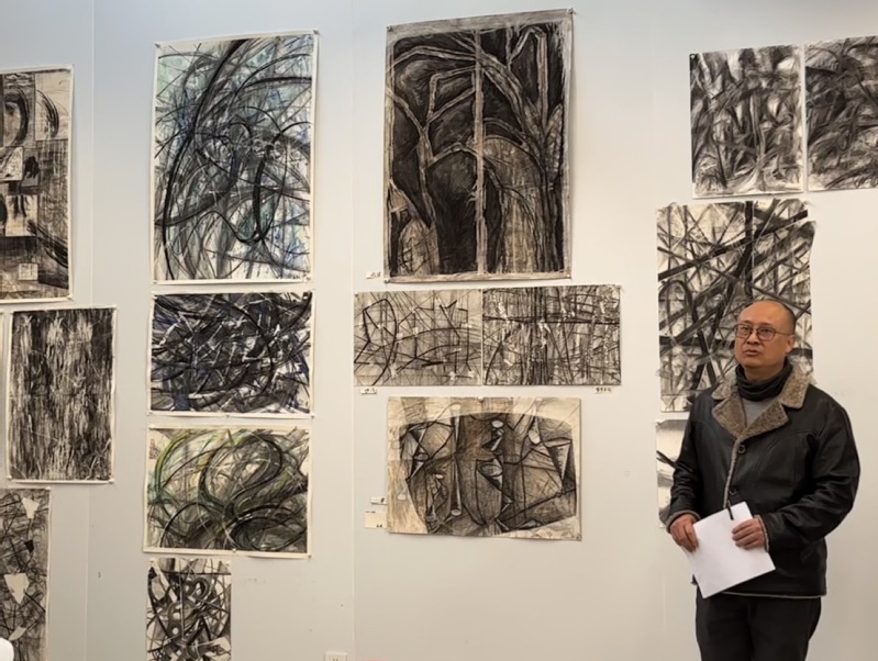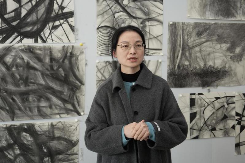 课堂四周墙面挂满了学生习作:狂放的线条交织,细腻的笔触铺陈,在黑白灰的丰富层次中,清晰呈现出学生从观察实物到提炼抽象语言的创作轨迹。周莉副院长