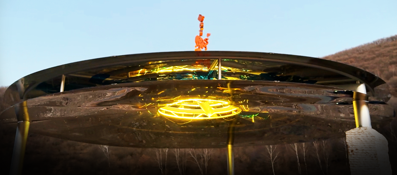作品用具有弓阳气质的符号将画转换为雕塑,雕塑利用山灵传说制造悬念,以抽象牛头为造型,放置于山包上,体现见山灵首不见尾的悬念和神秘感。牛头顶部设置开放空间,当观众进入内部空间时,牛角处的镜面不锈钢会折射出远处的风景。