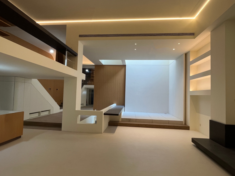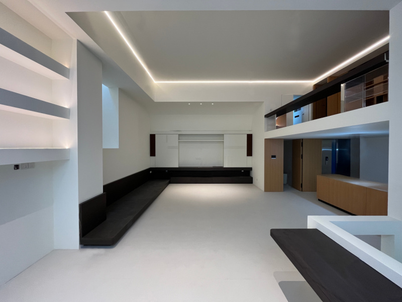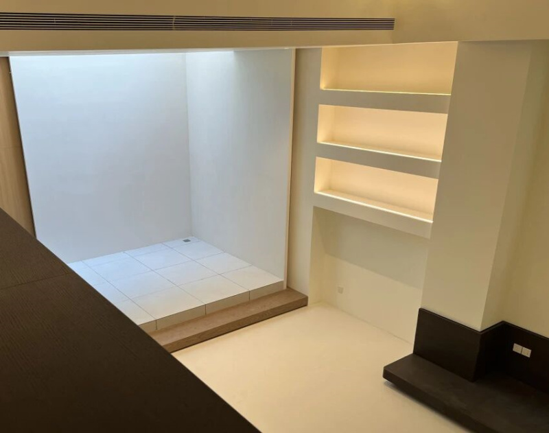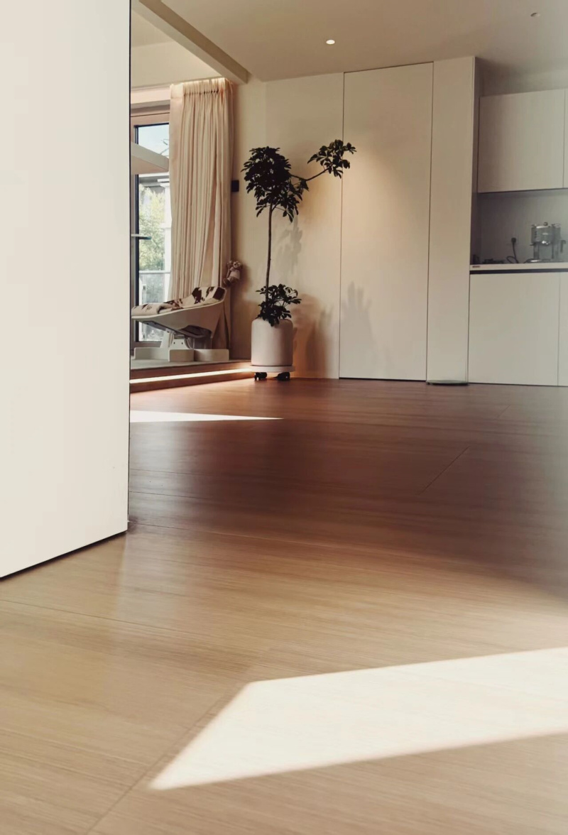 公共区域夹层以冠珠木纹砖铺陈自然感,为留白简境注入自然生机。