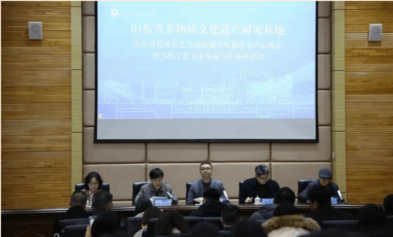 12月8日,山东省非物质文化遗产研究基地“山东省传统技艺与旅游融合发展研究中心”成立暨当代工艺美术发展与评论研讨会在长清校区举行。党委委员、副院长韩文涛,山东省文化和旅游厅非物质文化遗产处处长、一级调研员张百科,山东省文旅厅非遗处张驰,《中国非物质文化遗产》期刊编辑罗珊,中国艺术研究院工艺美术研究所副研究员牟晓林,《山东陶瓷》主编、山东理工大学教授怀康,齐鲁师范学院文学与历史文化学院副院长、教授朱振华,正高级工艺美术师、泰山产业技能领军人才张道勇,山东工艺美术学院副教授张传寿,基地负责人姜坤鹏教授等出席活动。开幕式由科研处处长胡春景主持。