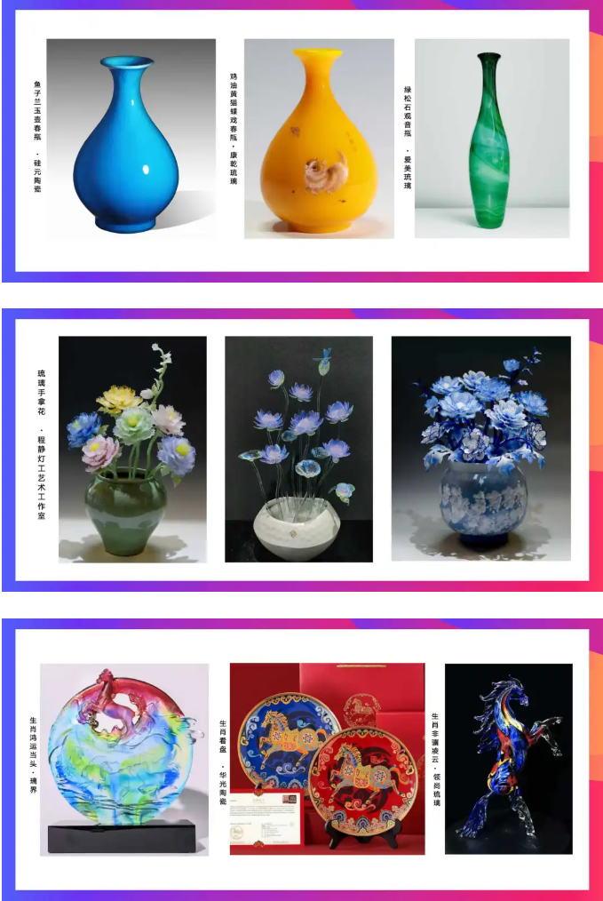 开幕式现场,一场融合传统工艺与现代美学的走秀惊艳全场。山东轻工职业学院模特们手拿华光国瓷《一马当先》摆盘、硅元国瓷的鱼子蓝玉壶春瓶、康乾琉璃的鸡油黄猫蝶戏春瓶、爱美琉璃的松石观音瓶、领尚琉璃琉璃马摆件、璃界琉璃的鸿运当头、程氏琉璃的灯工琉璃手拿花、桢寅堂的齐风大肚马、徐月柱艺术馆的飞黄腾达唐马琉璃摆件以及雨点釉博物馆的马上发财陶瓷摆件进行了走秀,陶瓷鱼子蓝、琉璃鸡油黄、孔雀绿的瓶子代表着平平安安,灯工琉璃花寓意着美美与共,花瓶盛花、摆件添韵,一抬眼便见吉祥,一呼吸皆是美好;看盘、鲁青瓷、琉璃、雨点釉……把生肖的祝福揉进柴米油盐,有滋有味又闪闪发光。模特们步履从容,将淄博陶瓷的温润质感与琉璃的璀璨光华徐徐展现,每一步都踏出工艺与美学的交响。