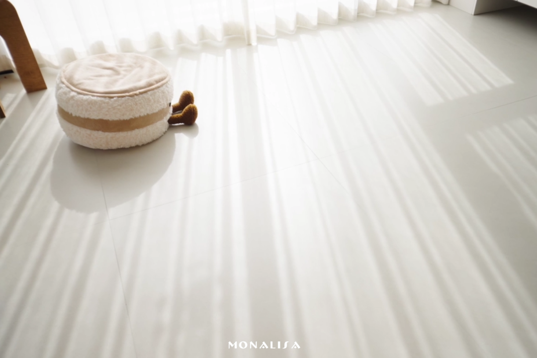 素色的地面没有张扬纹理,近看却藏着丰富的质感细节,以柔和的静谧和光感,包裹着空间与生活。