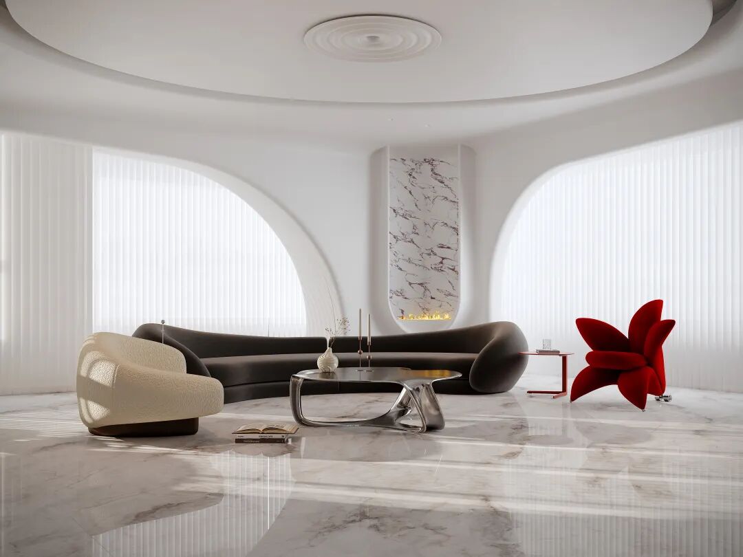 值得一提的是,其95°镜面平抛技术处理后的砖面,光感柔和而不刺眼,呈现出类似高级玉石的润泽光晕;触感温润细腻,实现了珍稀石材的纹理张力与玉石内敛质感的完美统一。