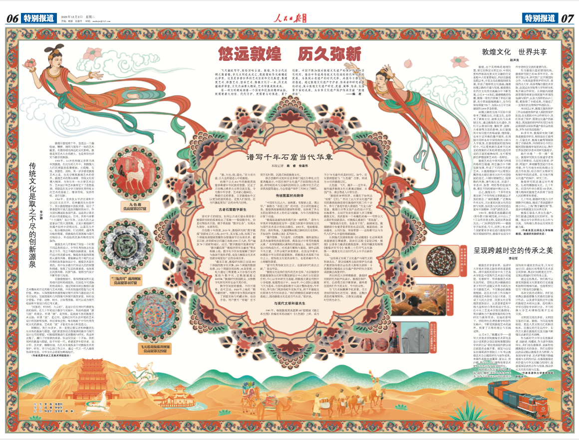 作为近年来中国敦煌艺术国际传播中极具分量的文化事件,本次展览受到海内外广泛关注与高度评价,人民日报、中国日报、中新社、联合国新闻等中外主流媒体均予以重点关注与深度报道。其中《人民日报》以整版专题,系统梳理清华美院深耕敦煌艺术研究与设计转化的长期积淀,清晰呈现其学术传承脉络与当代价值。原中央工艺美术学院院长、清华大学美术学院教授常沙娜强调,“中华优秀传统文化是取之不尽、用之不竭的创新源泉”。敦煌研究院研究员(敦煌研究院前院长、党委书记)赵声良指出,敦煌艺术所体现的开放包容精神,对当今构建人类命运共同体具有重要启示意义。策展人李迎军表示,本次展览以研究为根基、以设计为路径,旨在以敦煌艺术为桥梁,促进多元文化的交流与互鉴。