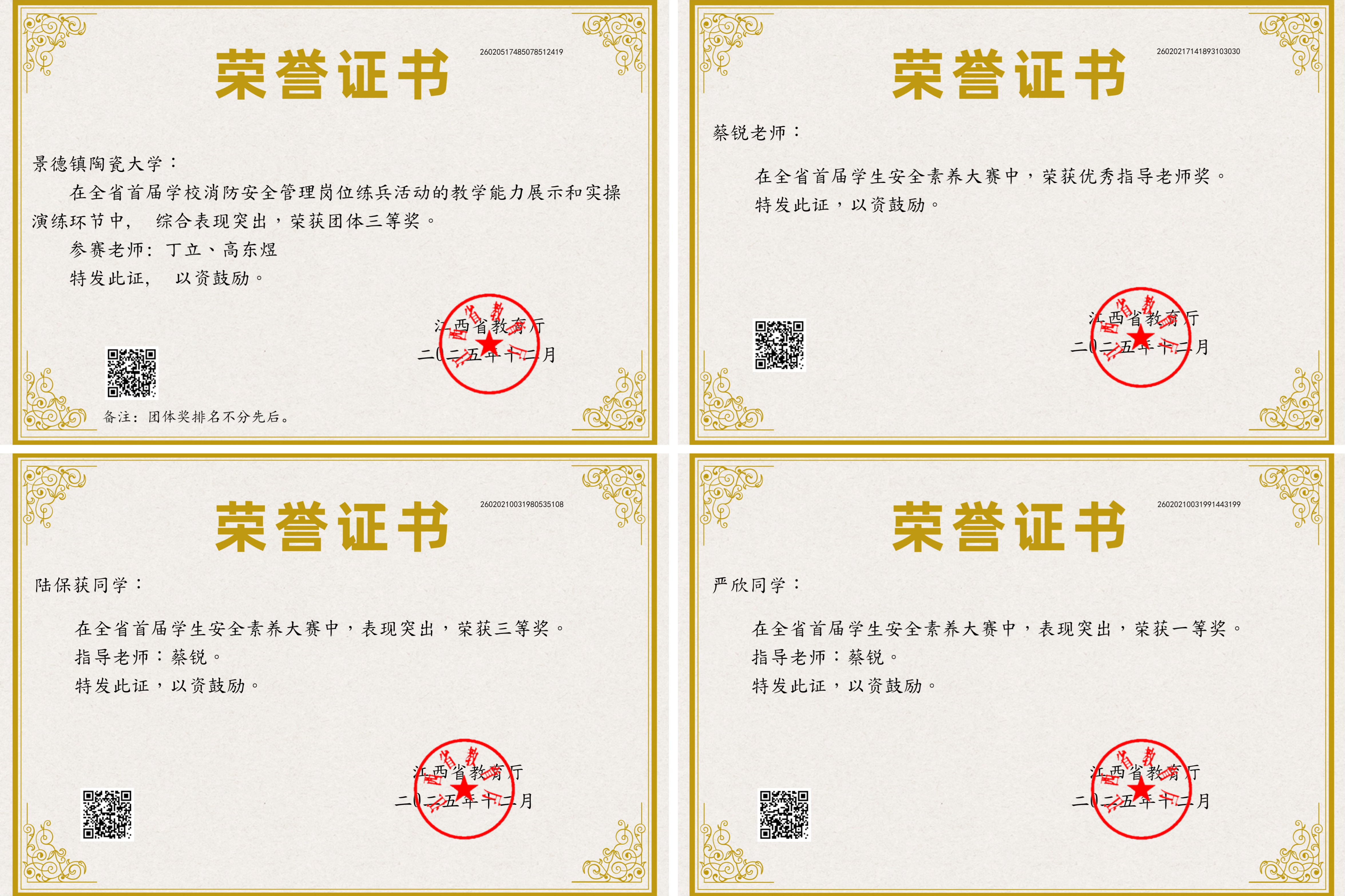 本网讯(保卫处 蔡锐)近日,江西省教育厅公布了全省首届教育系统安全素养大赛获奖结果。我校学子共斩获高校组一等奖1项,三等奖1项,保卫处教师蔡锐荣获“优秀指导老师奖”,我校在全省学校消防安全管理岗位练兵活动中荣获“团体三等奖”(参赛老师:丁立、高东煜)。