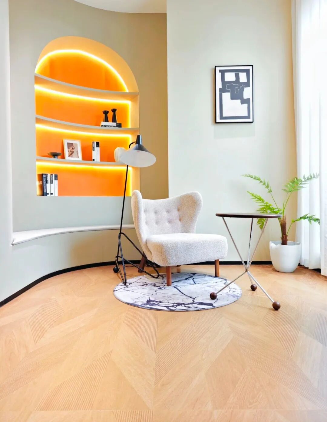 入口处的半掩门颇有有中国园林造景的情绪意境,随后便是艺术馆场景陈列,墙上五幅新品“艺术画”以及展柜中的几何拼接样品,无不展现出欧文莱瓷砖精微的细节塑造能力,更体现了新一代产品的工艺细腻度。