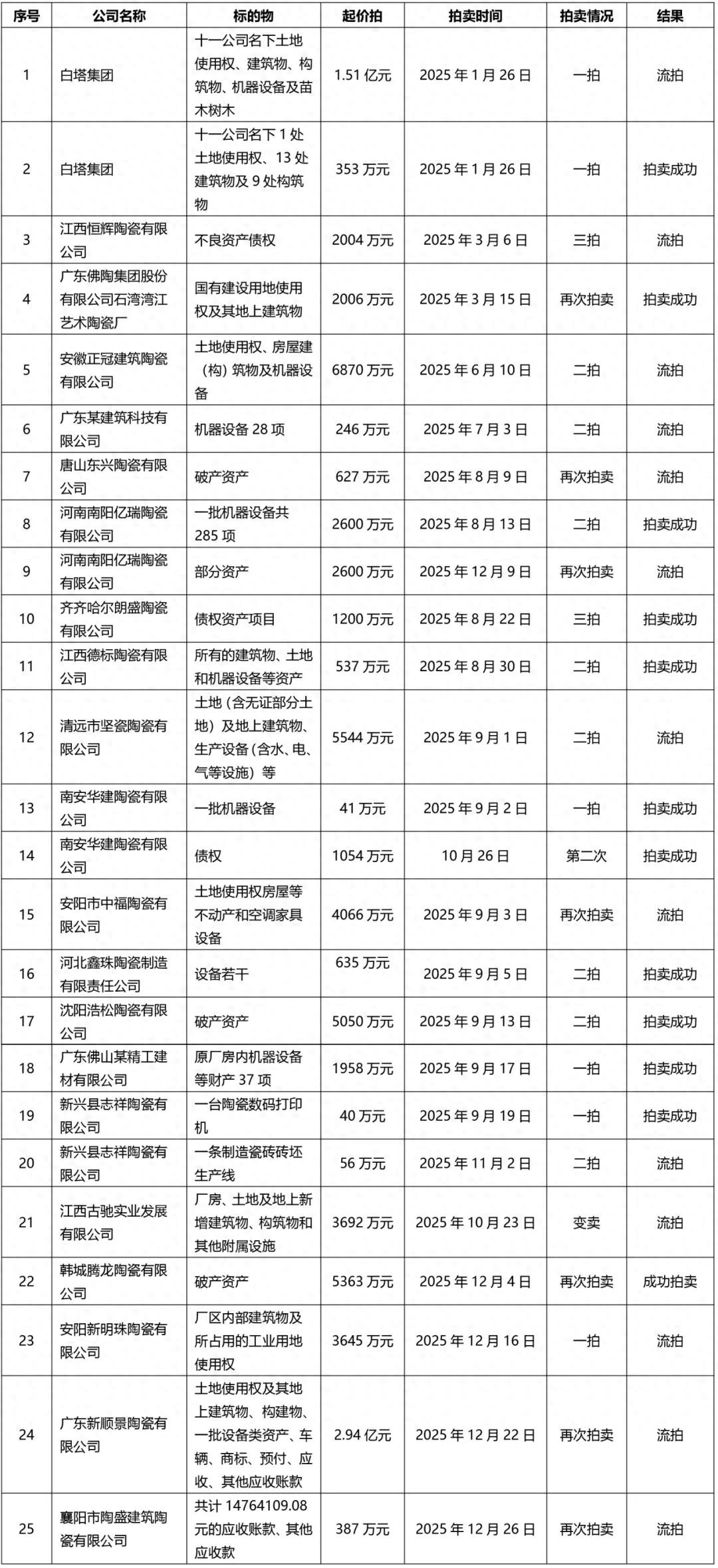 2025年陶瓷行业资产拍卖覆盖广东、四川、江西、河南、河北、安徽等多个主要产区,反映出行业资产调整在全国范围内展开。统计显示,超23家企业涉及土地、厂房、设备等资产拍卖,整体处置成功率偏低,流拍率达56%。其中,整厂及大宗不动产因起拍价高、接手门槛复杂而普遍遇冷;相反,各类设备拍卖成功率较高,成为市场的“硬通货”。