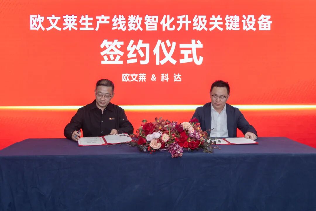 3月3日,欧文莱与科达制造在佛山举行生产线数智化升级关键设备签约仪式,双方代表签署合作协议,标志着欧文莱在深化高端制造与柔性生产能力方面进入实质性阶段。