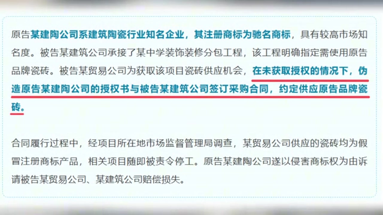 佛山某贸易公司因伪造知名建陶企业授权书,销售假冒瓷砖,被法院判处支付五倍惩罚性赔偿。该侵权行为不仅损害了品牌方权益,也扰乱了市场秩序。案件警示企业应诚信经营,尊重知识产权,消费者在选购时也需提高警惕,认准正规授权渠道。