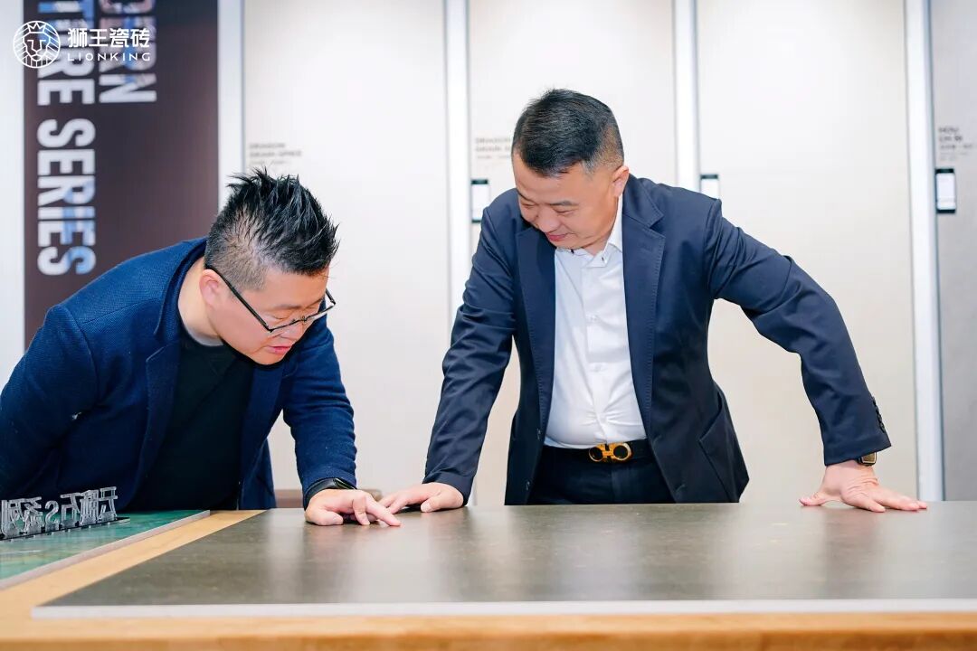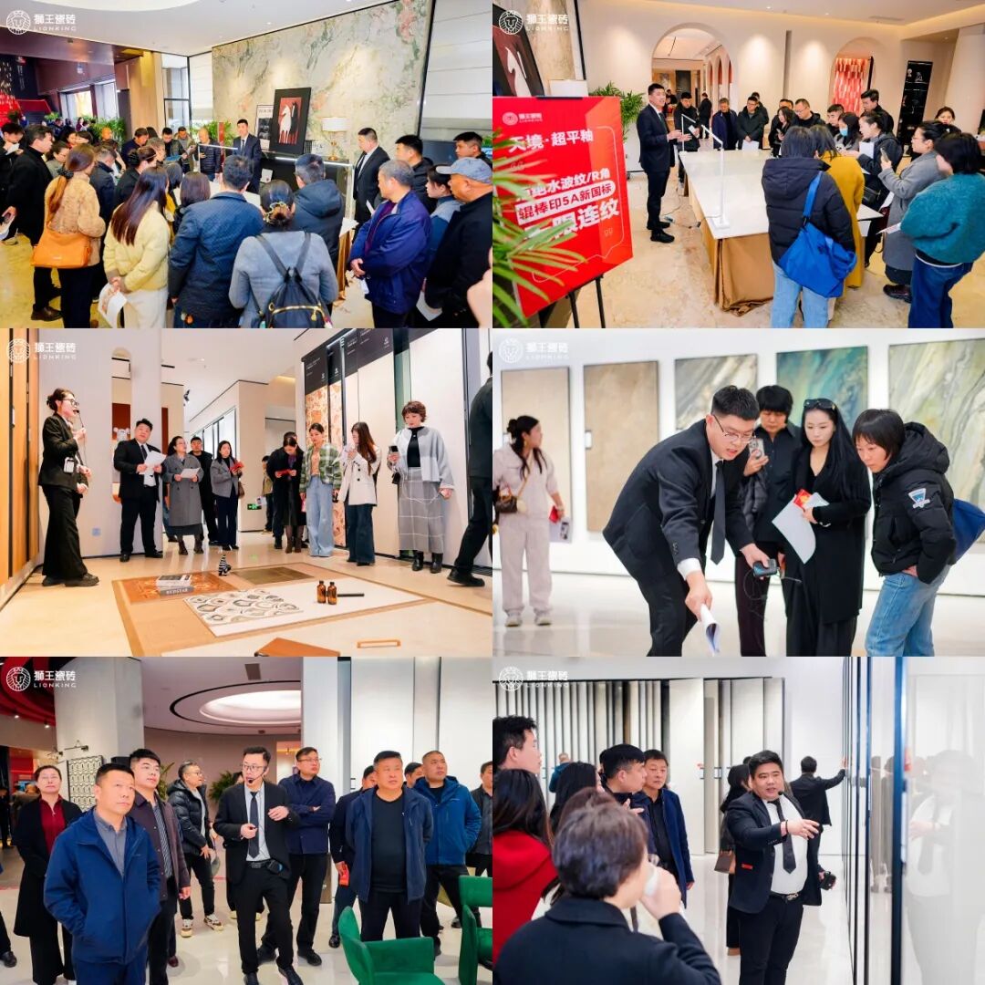 在榜样力量的感召下,本次盛会迎来重磅环节——2026年春季新品云脉石S系列揭幕。狮王集团董事长刘宝、新媒体营销专家胡俊及多位优秀经销商代表共同为新品揭幕。云脉石S系列延续了战略大单品的差异化优势,以专利技术门槛和卓越工艺质感,为终端提供能打硬仗、能赚利润、能立口碑的核心武器。同时,古堡砖、天境·超平釉大理石、瓷木地板三道釉、琉璃釉等多款新品也在展厅同步亮相。