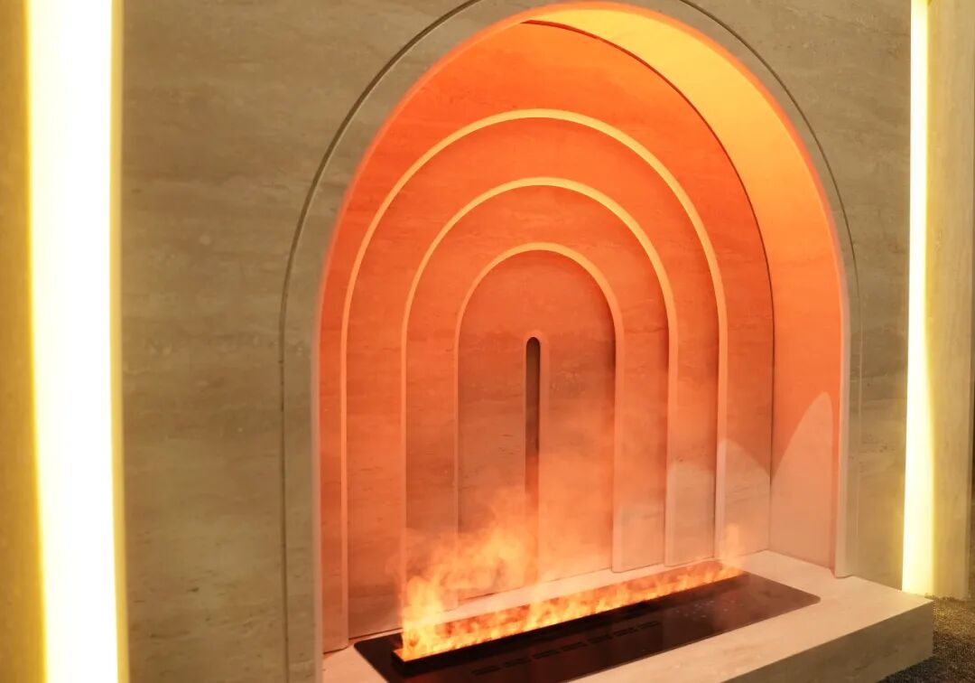 其次是设计应用层面,新岩素提出的“和”同样体现在材质的和谐上。展馆内通过岩板定制长桌、壁炉等具象化应用,材质本身消弭了界限,展示了岩板作为“自由定制的无限载体”的能力。