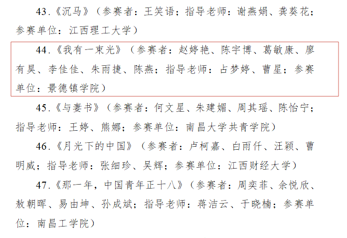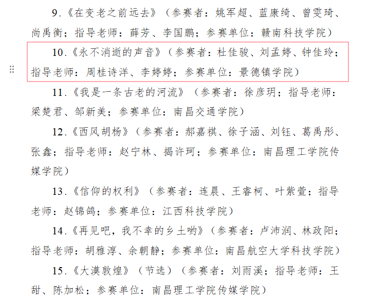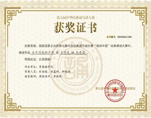 其中,作品《永不消逝的声音》(参赛者:杜佳骏、刘孟婷、钟佳玲;指导老师:周桂诗洋、李婷婷)和《百年交响》(参赛者:廖梓芊、胡菲珂;指导老师:邹杰群、钟楚婷)均荣获教育部主办的第七届中华经典诵写讲大赛大学生组优秀奖和省教育厅组织开展的“中华经典行 赣鄱好声音”系列活动暨第七届中华经典诵写讲大赛二等奖;而《秋瑾》(参赛者:臧映淇、王歆元、任翔宇、刘晓燕;指导老师:周桂诗洋、李婷婷)和《我有一束光》(参赛者:赵婷艳、陈宇博、葛敏康、廖有昊、李佳佳、朱雨捷、陈燕;指导老师:占梦婷、曹星)则分别获得“中华经典行 赣鄱好声音”系列活动暨第七届中华经典诵写讲大赛二等奖和三等奖。