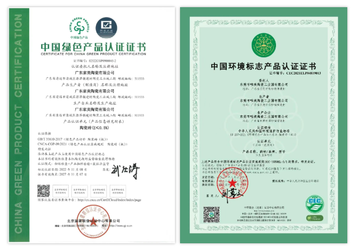 马可波罗控股国内五大产区均通过质量/环境/职安管理体系认证、能源管理体系认证、环境管理体系认证、低碳产品认证,打造5A品质、健康环保的绿色产品。公司旗下广东家美陶瓷有限公司、江西和美陶瓷有限公司、江西唯美陶瓷有限公司、重庆唯美陶瓷有限公司四个子公司均通过国家市场监管总局等部门授权的“绿色产品认证”,旗下东莞市唯美陶瓷工业园有限公司通过中华人民共和国生态环境部授权的“十环(中国环境标志产品)认证”。
