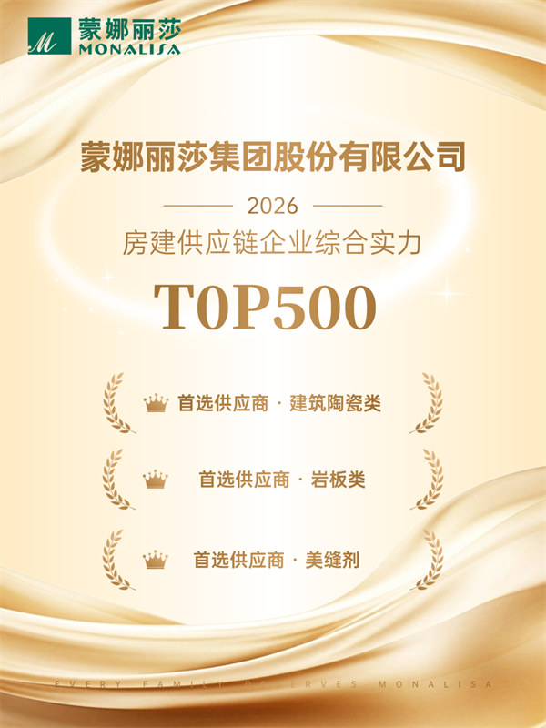 近日,以“深耕新时代”为主题的2026中国房地产TOP500研究成果发布会暨房地产发展高峰论坛在京启幕。蒙娜丽莎集团股份有限公司入选房建供应链企业综合实力TOP500首选供应商,获得建筑陶瓷、岩板、美缝剂三大品类实力认证,分别位列各类榜单TOP2。