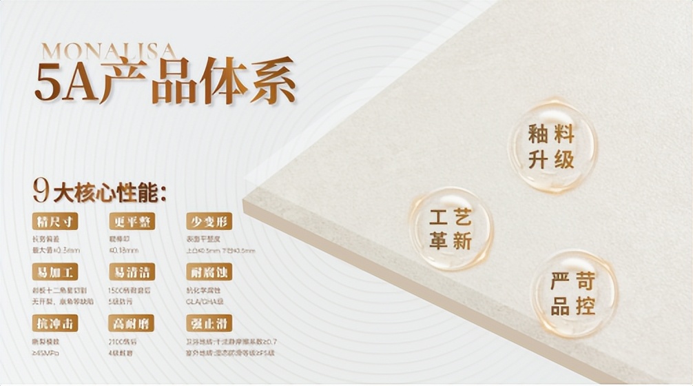 伴随“好房子”建设走向系统化与标准化,蒙娜丽莎对标国家最高质量等级,构建覆盖室内外陶瓷砖及岩板的“5A”产品体系。通过全链条严控品质,产品在防滑、耐磨、抗污染等性能上均达高标准,为个人居所及医院、校园等公共空间提供安全、耐久的高品质材料选择。