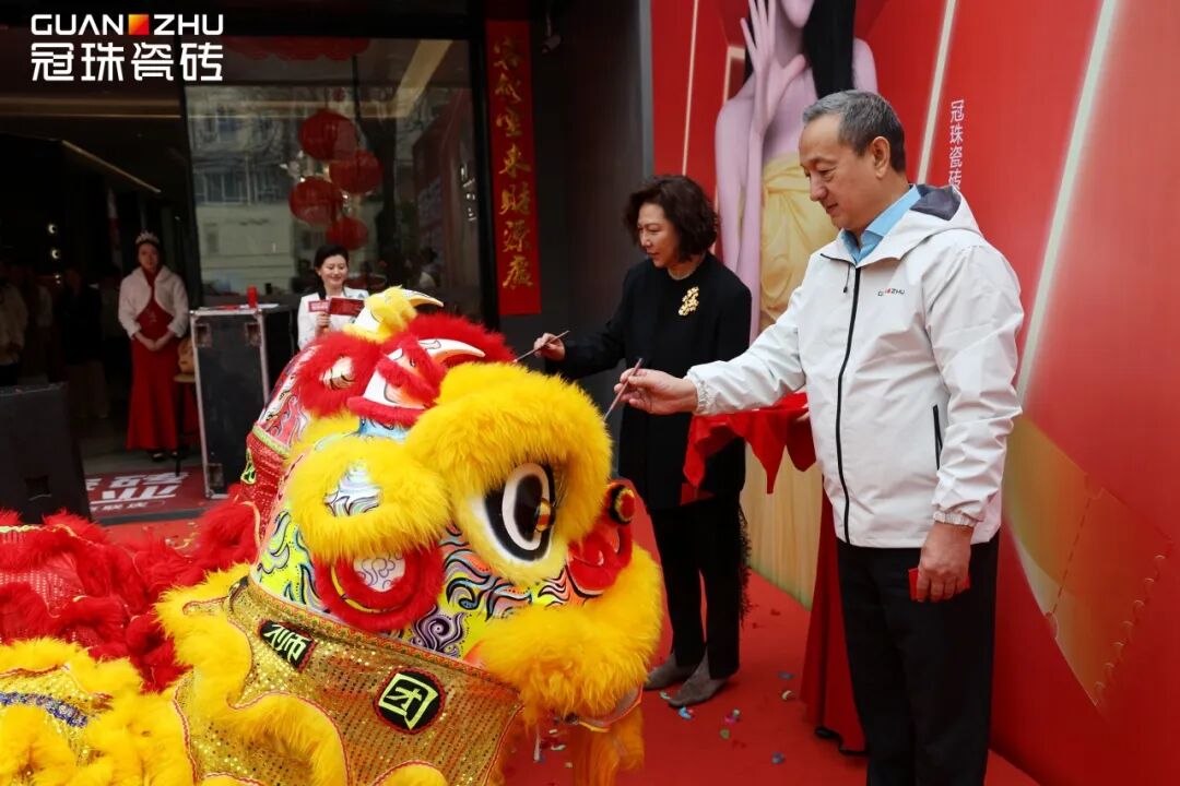 冠珠瓷砖石家庄营销中心董事长李三忙共同为舞狮点睛
