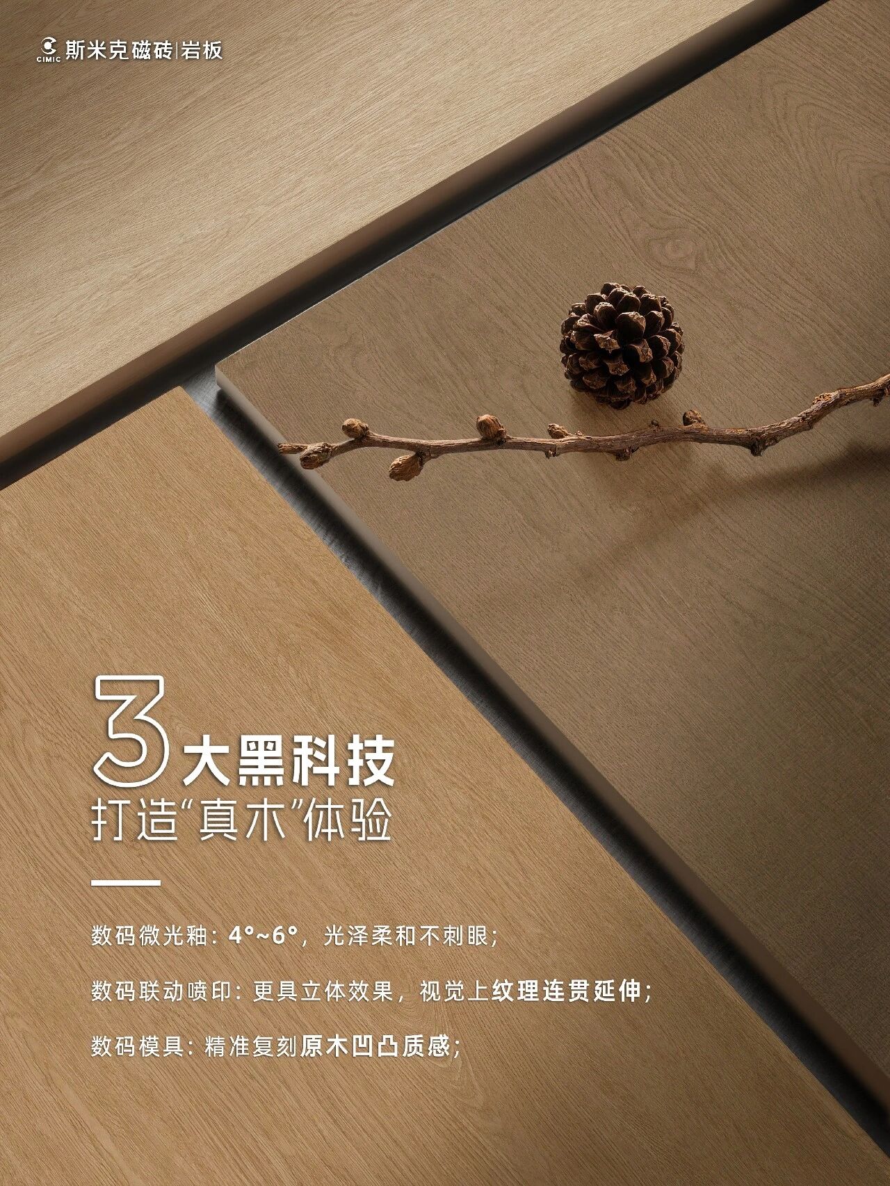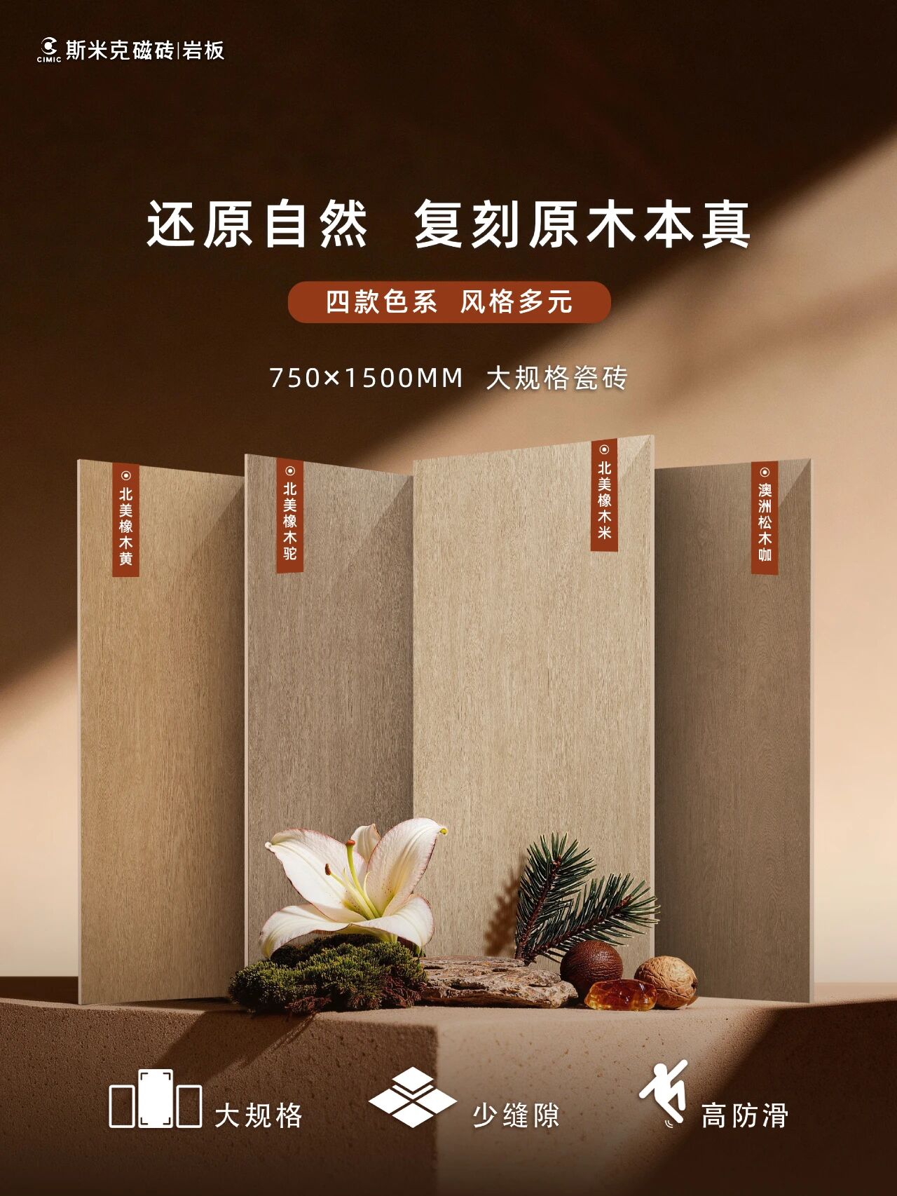 该系列提供四款自然色系,从浅米到深咖,适配多样装修风格。其表面采用柔光釉工艺,光线柔和护眼;立体模具技术还原木材触感,纹理连贯逼真。大规格设计减少铺贴缝隙,视觉更整体,清洁也更轻松。无论是家居全屋通铺,还是商业空间使用,都能兼顾美观与耐用,让您不再取舍,轻松营造温馨又省心的理想空间。