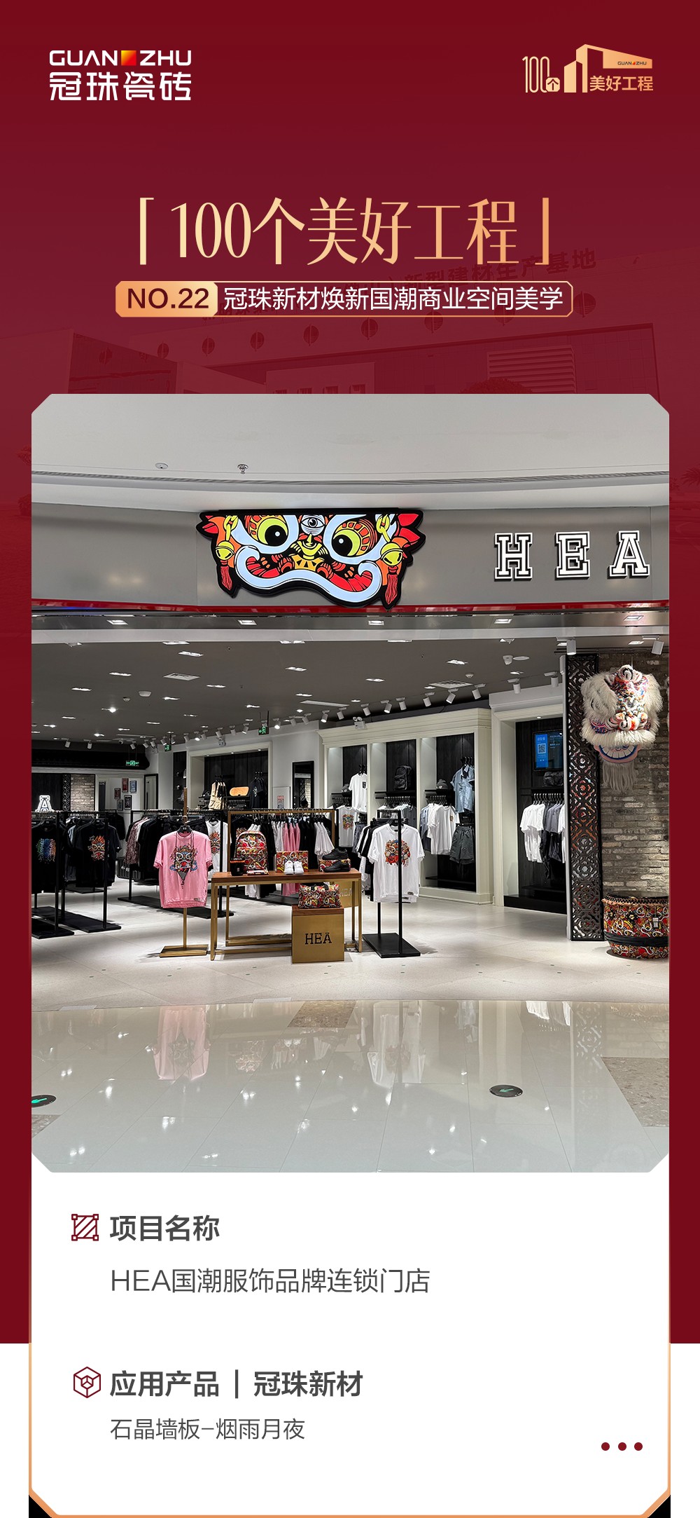 HEA门店是冠珠新材在国潮商业空间的一个标杆。案例背后,是冠珠瓷砖空间场景升级应用的深耕积累。