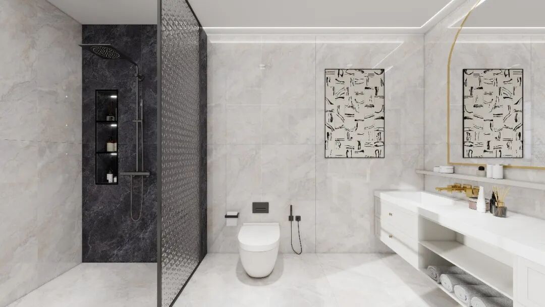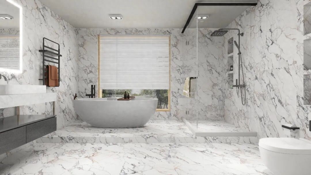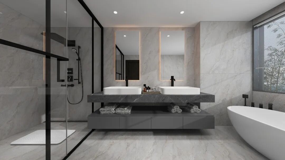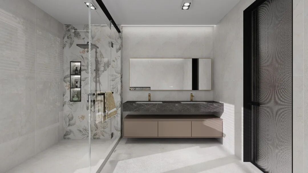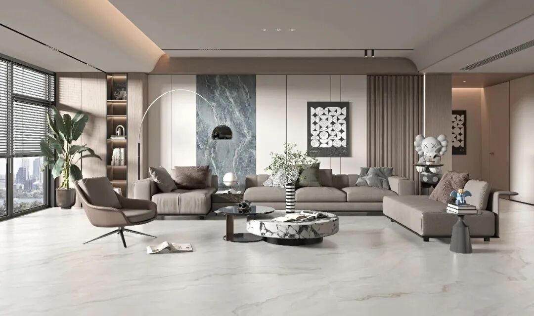 其表面采用亮哑融合设计,经蜡抛工艺呈现22-28°柔和微光,光线流转间亮而不刺眼,哑而不暗淡,营造出温润舒适的空间氛围。暖色系奢石花型的选择,更契合高阶审美,传递生活温度与归属感。