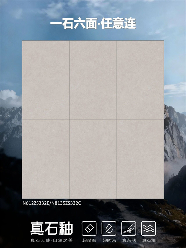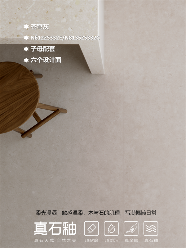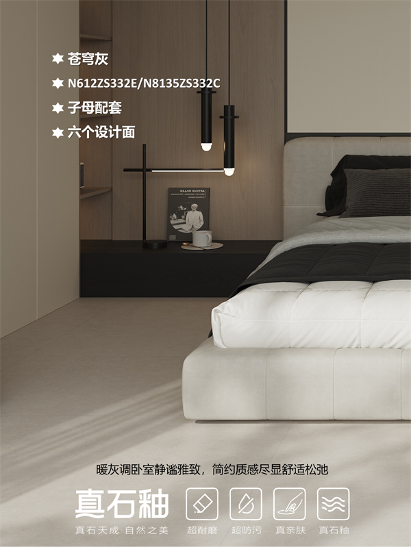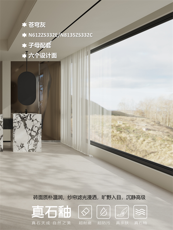 这款苍穹灰 ,型号为N8135ZS332C,还有子母配套款N612ZS332E。它像是将天地间的诗意凝于砖面:如广袤天际的云雾交织,灰调深浅变幻似星河隐现,没有死板的纯色,细腻的真石釉质感温润亲肤,自带高级滤镜。