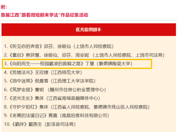 本网讯(党委宣传部)近日,由省司法厅、省委网信办、省广播电视局、江西日报社主办的“有法好看·剧剧精彩”——首届江西“跟着微短剧来学法”主题活动圆满落幕。经层层筛选与严格评审,由我校报送的作品《向阳而生——校园霸凌的救赎之路》(作者:马克思主义学院硕士研究生丁慧)在本次评选中被评为优秀原创剧本。