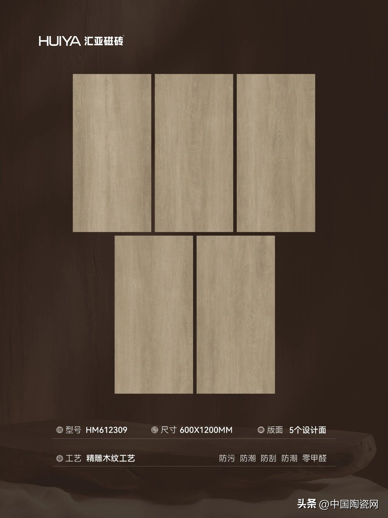 该砖拥有五个自然过渡的设计面,拒绝呆板重复;600x1200mm黄金规格减少缝隙,更美观实用;数码精雕技术像素级复刻木材年轮;零甲醛、防潮防霉,健康环保。