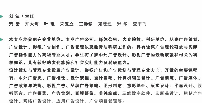 艺术设计学专业依托我校综合艺术的平台优势,多年来形成了与设计学科各专业密切交叉、融合并进的发展特色。本专业落实立德树人的根本任务,全面贯彻以学生发展为中心、以学习成果为导向的教育理念,致力于以扎实的设计理论素养和学术能力培养为目标,通过连贯性、延展性、系统性的“设计史论研究”和“设计策划管理”两大课程模块,培养学生强烈的责任意识、科学的理性精神、领先的审美鉴赏力,强化学生的设计理论素养,提升设计思维、设计沟通和设计策划管理能力,锻造学生的人文素质、艺术修养和职业素养,涵养学生的家国情怀和学术精神,培养学生成为具有坚定的政治理想信念并能胜任艺术设计史论研究和设计策划管理的复合型人才。