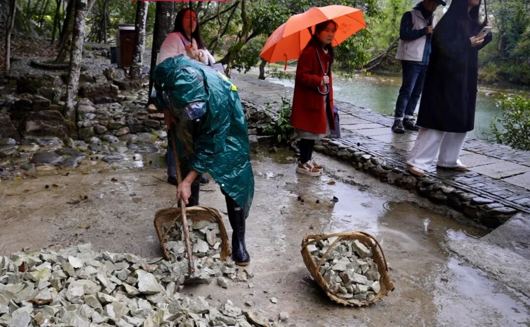 活动现场,国家级非遗代表性传承人詹和安为学员讲解瓷业水碓营造的精髓技巧;省级非遗代表性传承团体成员詹金发则身着雨衣,冒雨挑着釉果前往河边清洗,用最朴素的行动,展现着非遗技艺的坚守与传承。
