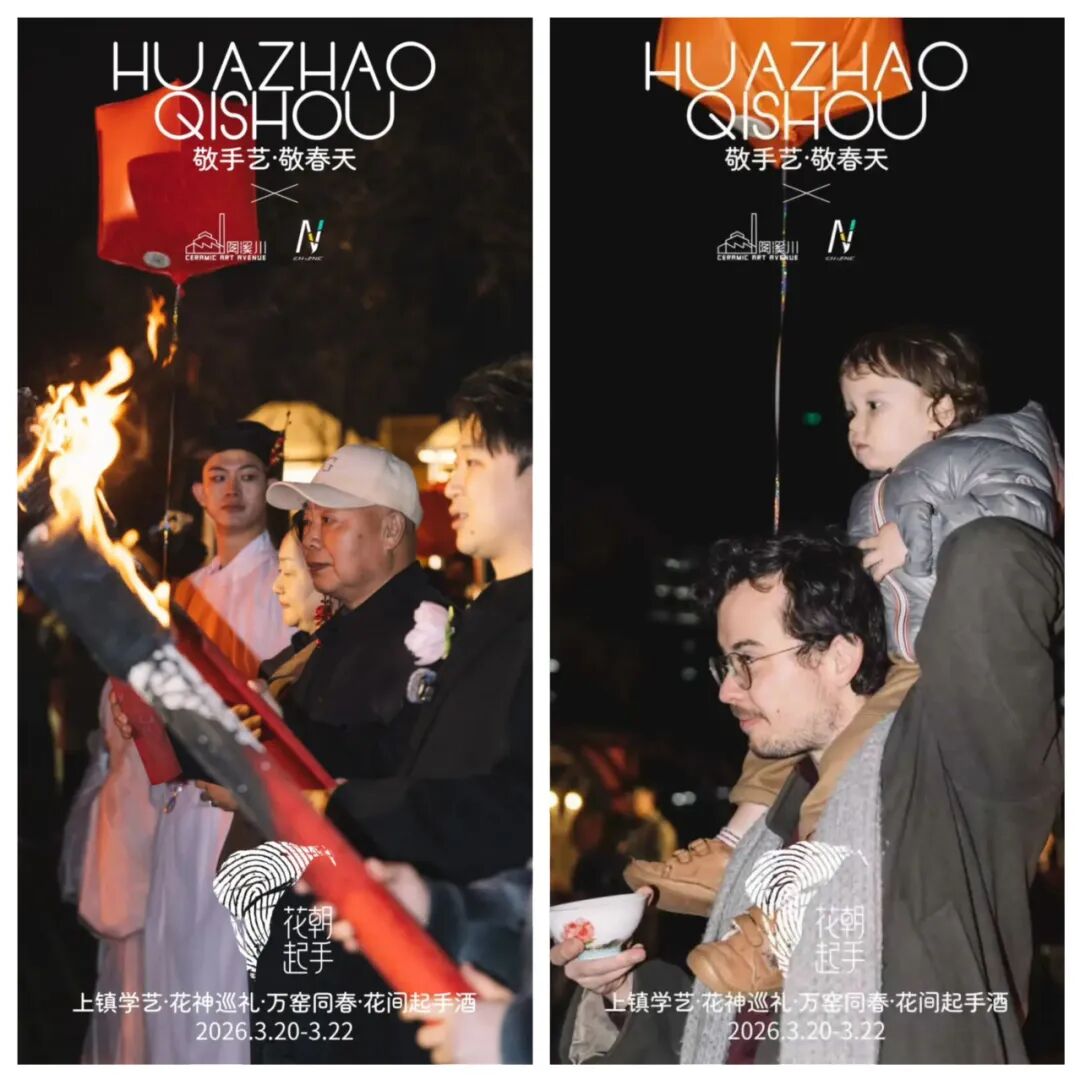 “起手·敬厚土”仪式庄重而热烈。以四季为序、十二花神为引,现场分四轮敬颂全城手艺脊梁。每一轮敬酒,全场齐喊景德镇方言号子“yo huo!起——起——起起起——起!”,浑厚的呐喊穿透雨幕,饱含着手艺人对技艺的敬畏、对新年的期盼,更是对非遗保护工作的生动践行。老匠人、非遗传承人、青年创客等群体依次受敬,在春雨与敬意中,筑牢瓷都非遗传承的精神根基,践行非遗“活态传承、多元共生”的核心理念。