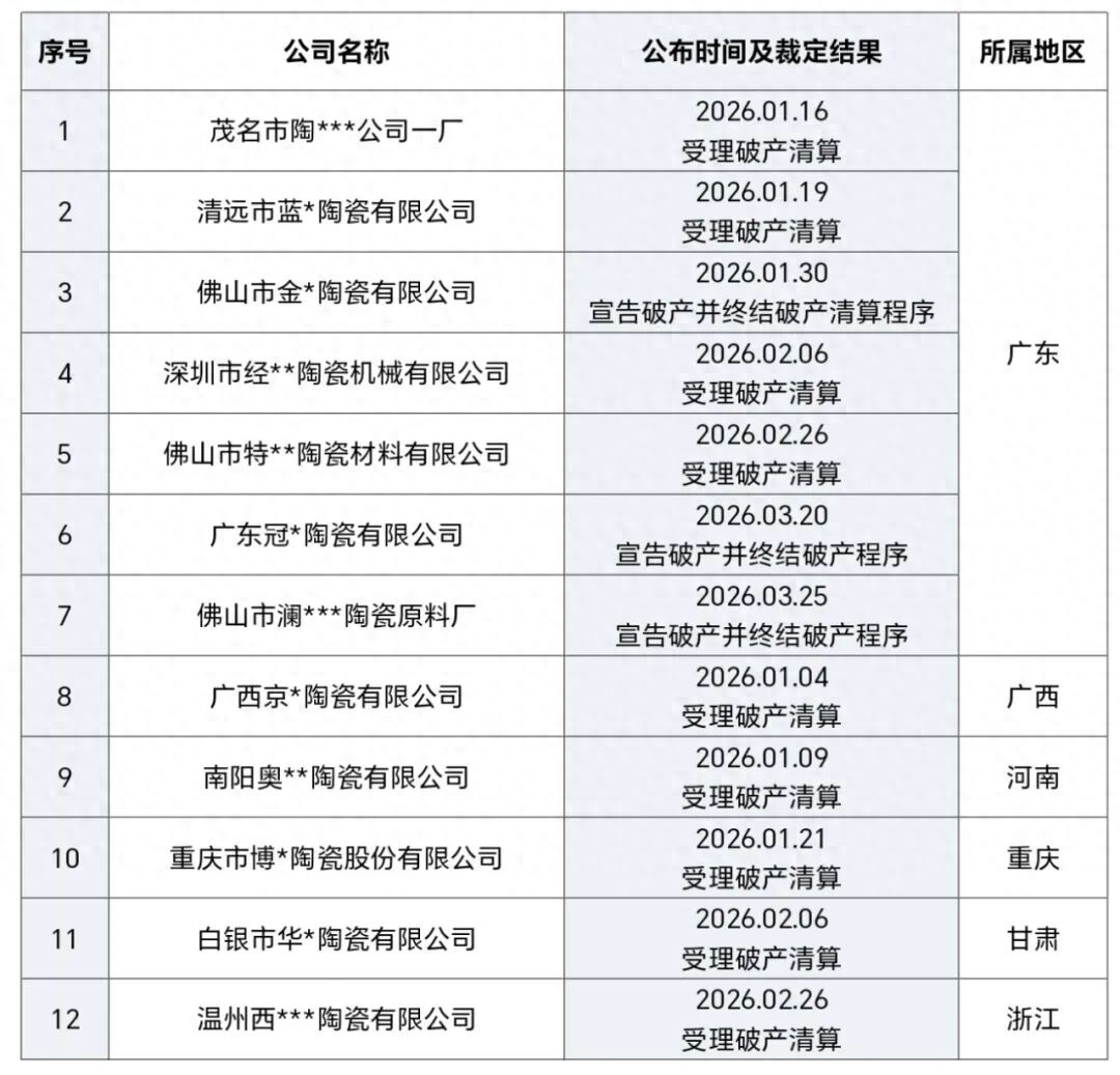 2026年第一季度,全国已有超过12家陶瓷企业进入破产程序,其中广东占7家,其余分布在广西、河南等地。破产企业涵盖陶瓷生产、原料机械及销售等全产业链环节,显示行业洗牌正全面展开。