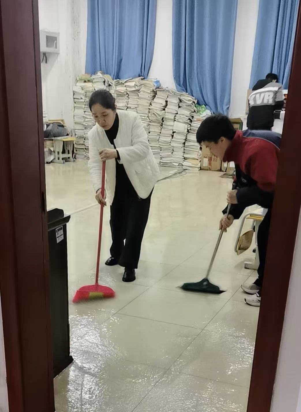 早到校的陈红梅老师目睹此景,未作片刻迟疑,也未等上报处理,便迅速行动起来。她径直拿起清洁工具,同时有序组织在场学生一同投入清理工作。众人齐心协力,分工明确,有的负责舀水,有的负责清扫,很快便将积水清理干净,及时排除了积水可能引发的诸多不便。