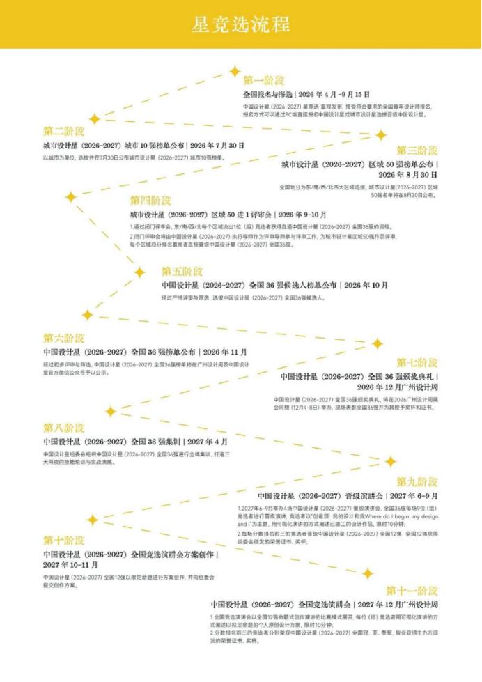 核心活动“星竞选”是设计界首个大型命题演讲真人秀,2022年起升级为双年赛。2026年3月起面向36岁以下青年设计师开放报名,通过海选产生全国36强。2027年将举办4场晋级演讲会,每场9位选手以“创意源:我的设计和我”为主题进行10分钟可视化演讲,每场前三名晋级全国12强。最终在2027年广州设计周期间举行全国竞选演讲会,决出冠、亚、季军。