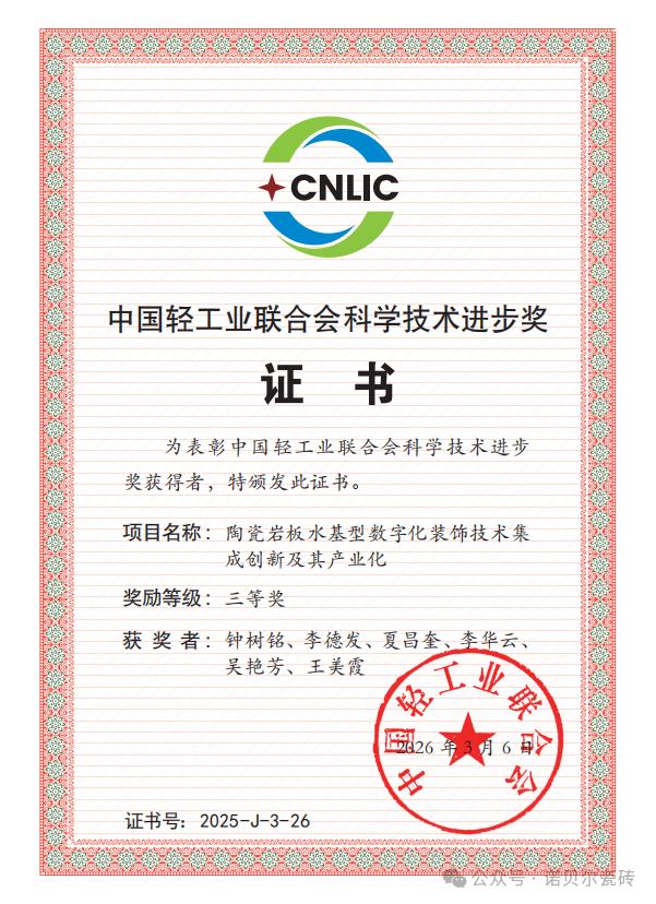 诺贝尔凭借《陶瓷岩板水性数字化装饰技术集成创新及其产业化》项目,荣获2025年度中国轻工业联合会科学技术进步奖三等奖。该项目聚焦于让瓷砖更贴近自然与生活,通过技术创新实现了更逼真的天然肌理、更温润的触感及更环保的材质,标志着行业从“参数竞争”向“体验价值”的转变。