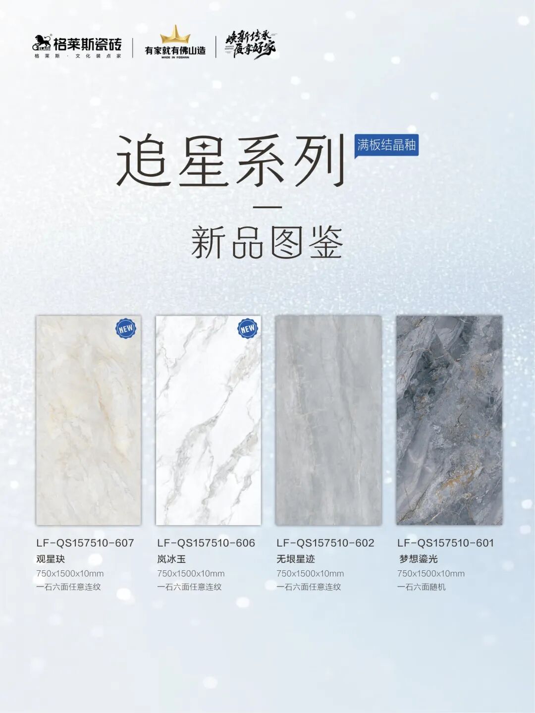 全新推出的追星系列瓷砖,将星空的浪漫融入匠心制造。系列包含无垠星迹、观星玦、岚冰玉、梦想鎏光四款产品,各具特色,适配不同家居风格。通过独特的工艺与设计,砖面呈现星光闪烁的视觉效果,旨在把星河的浪漫与希望带入家中。