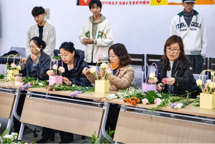 活动高潮在花香馥郁中到来。学生们化身专属花艺师,协助老师们创作春日花束。修剪绿叶花枝的沙沙声、此起彼伏的探讨声,编织成独特的节日交响。当专业老师将色彩元素融入花艺造型,巧用不同品种的花朵点睛,专业特色与节日仪式感在此完美交融。当老师们手捧着自己亲手参与制作的花束,与学生们合影留念时,那份喜悦与满足溢于言表。