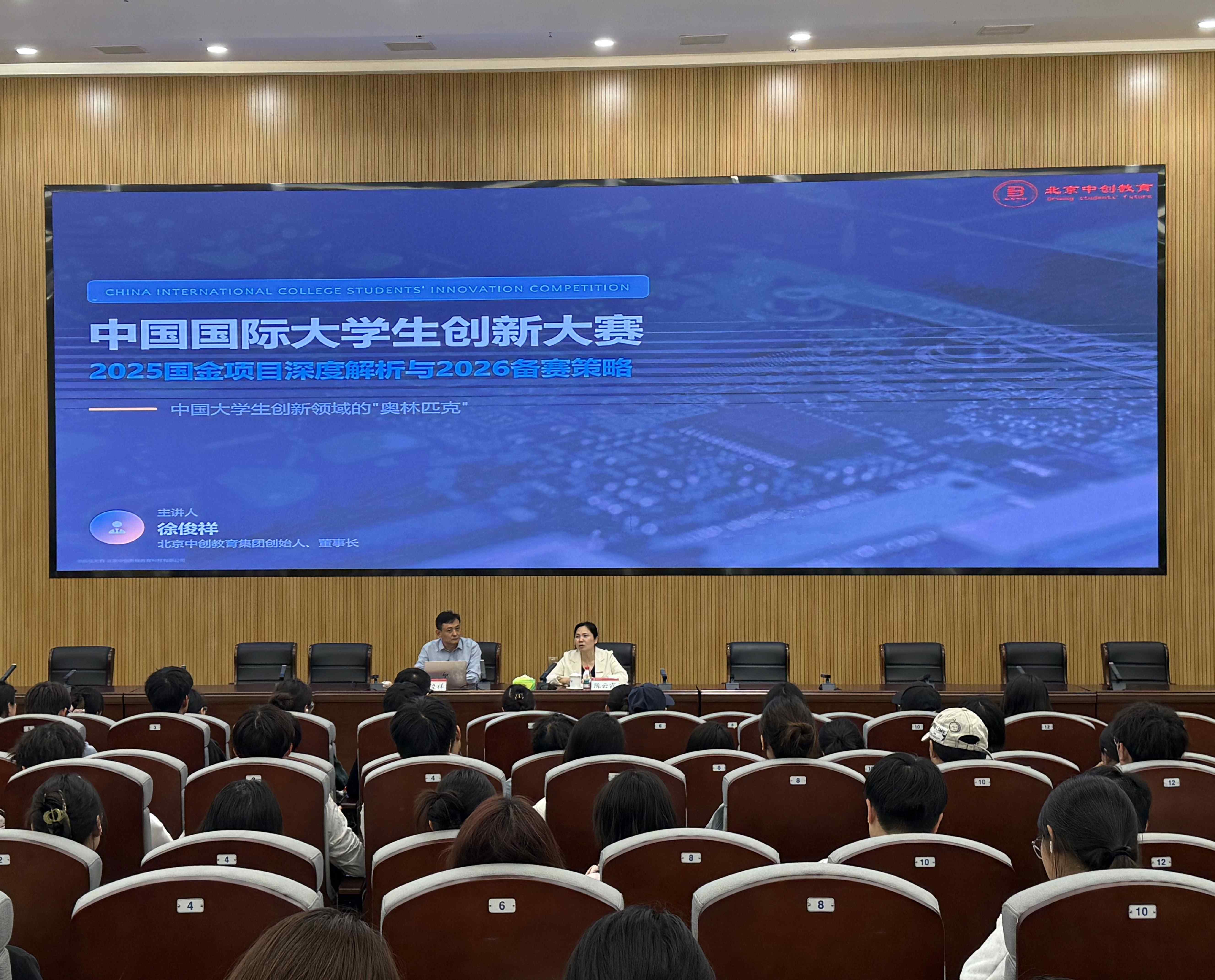 本网讯(教务处(创业学院)邹金成)为深入推进创新创业教育改革,系统备战中国国际大学生创新大赛(2026),4月9日下午,我校在湘湖校区研究生实验室楼一楼报告厅举办《中国国际大学生创新大赛2025国金项目深度解析与2026备赛策略》专题培训讲座,教育部首批全国万名优秀创新创业导师、北京中创教育集团董事长徐俊祥应邀主讲。校党委常委、副校长陈云霞出席并主持讲座。教务处(创业学院)有关负责人、各学院就业创业专员、参赛师生代表及创新创业学生社团成员等300余人参加讲座。