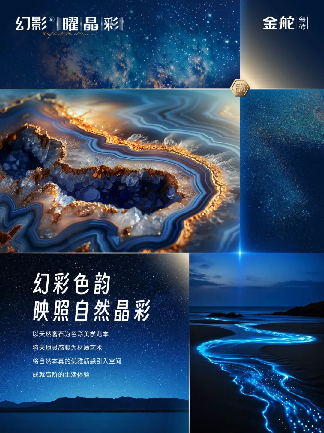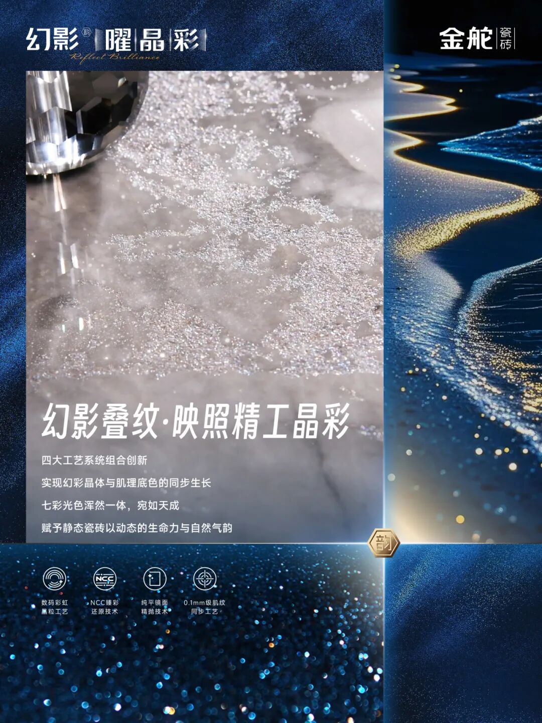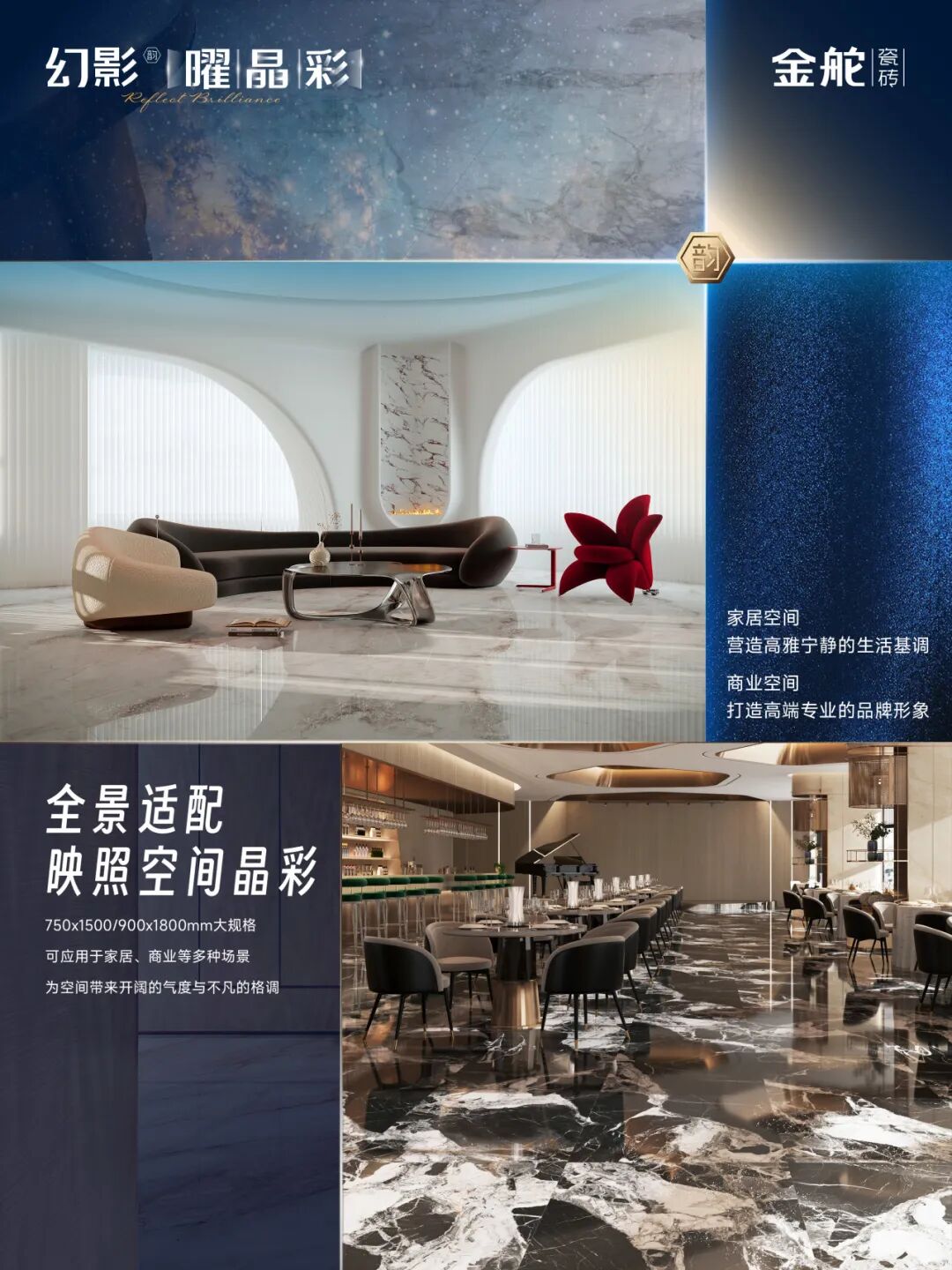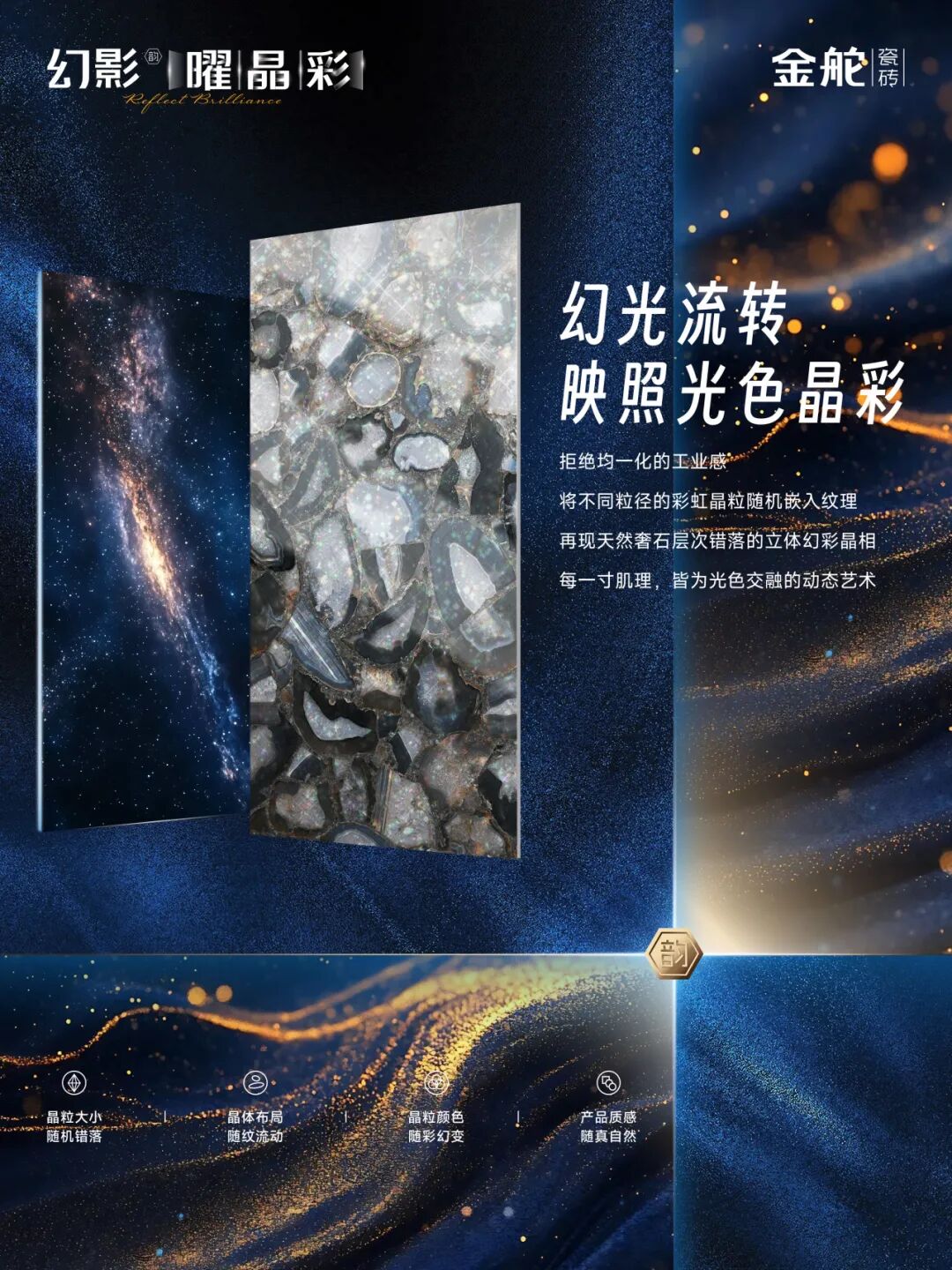 新品通过「数码彩虹晶粒」与「纯平镜面精抛技术」等前沿技术,使晶粒精准嵌入纹理脉络之中,犹如珍稀石材般七彩流光,实现了从“表现色彩”到“驾驭光影”的升华,让空间尽显高级质感和品位。