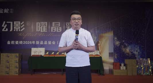 随后,品牌代表上台带来一场精彩的品牌分享。他详细介绍了金舵瓷砖的发展历程与品牌实力,同时发布了“金舵幻影”新品。