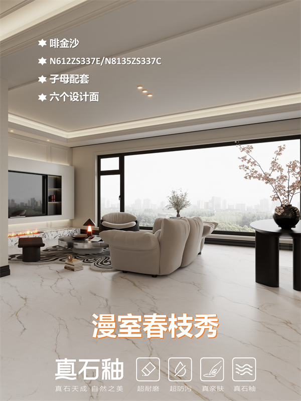 以真石为灵感,以釉面为笔触,能强真石釉系列「啡金沙」,用流动的金纹肌理,重构空间的高级感。