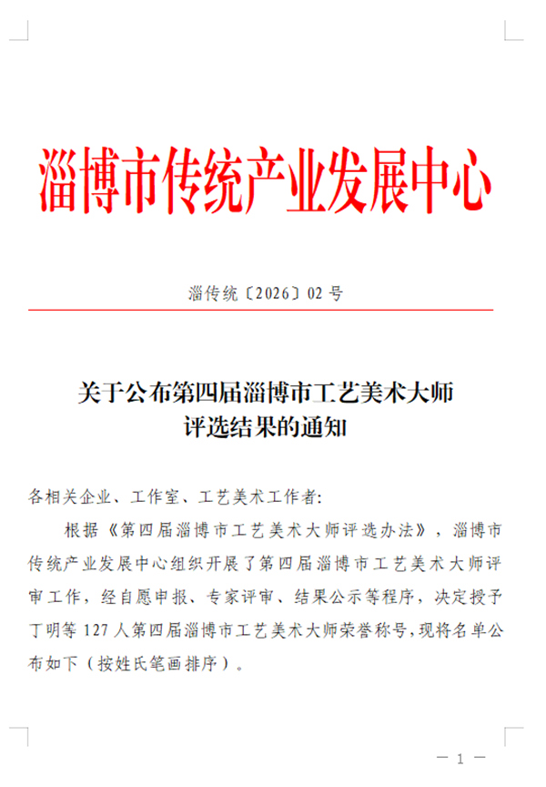 根据《第四届淄博市工艺美术大师评选办法》,淄博市传统产业发展中心组织开展了第四届淄博市工艺美术大师评审工作,经自愿申报、专家评审、结果公示等程序,决定授予丁明等127人第四届淄博市工艺美术大师荣誉称号,现将名单公布如下(按姓氏笔画排序)。