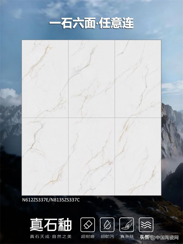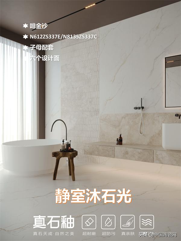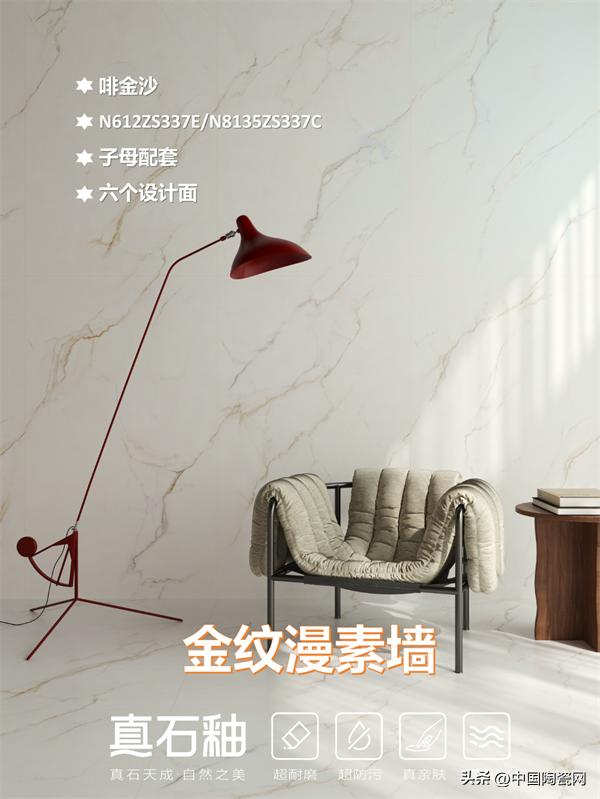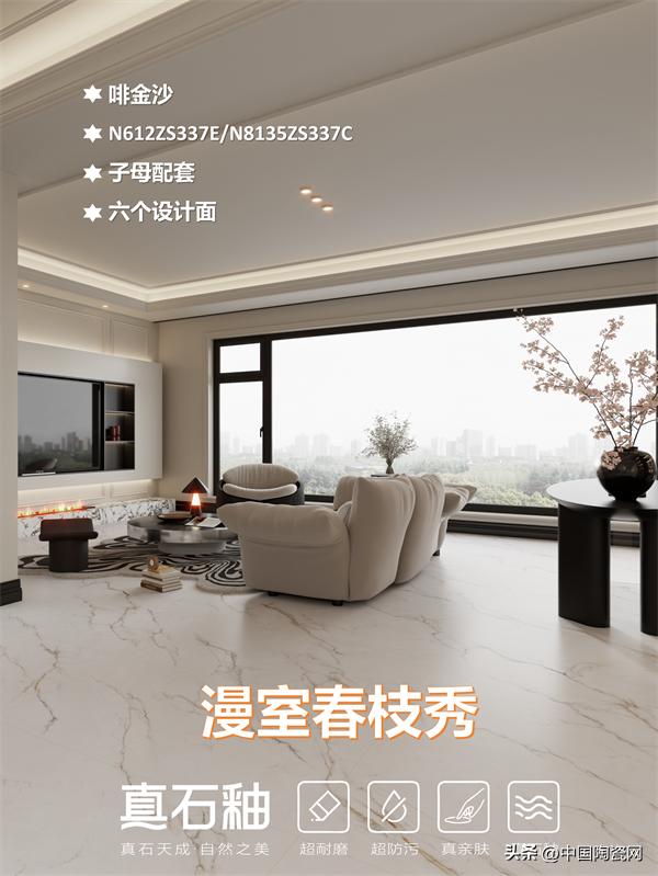 能强真石釉系列“啡金沙”,以流动的金色纹理重构空间高级感。其纹理如山川脉络般流畅灵动,配合10°-12°柔和石材光泽,还原温润的石材包浆质感。产品采用一石六面、任意连纹设计,打破铺贴局限,适配多元场景,让墙面与地面浑然天成。兼具超耐磨、超防污的硬核性能与亲肤触感,无论是客厅、餐厅还是卫浴空间,皆能轻松驾驭。在光影流转间,为家居勾勒出别致高雅、舒适自然的氛围。