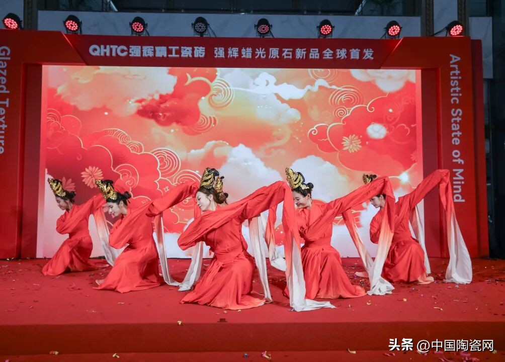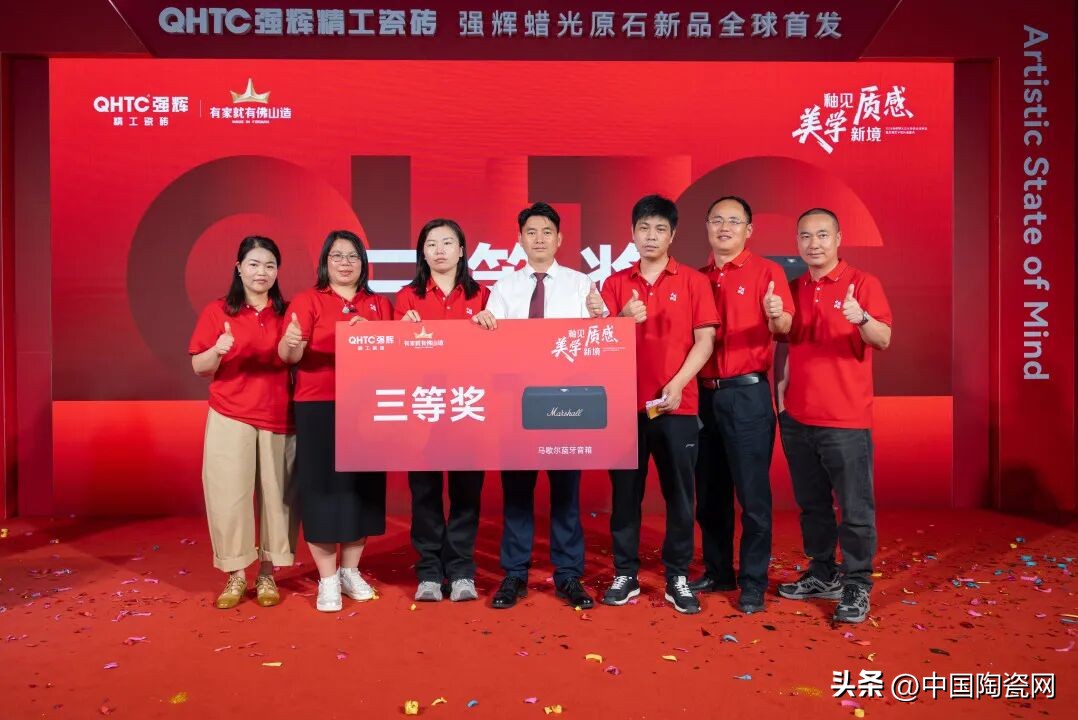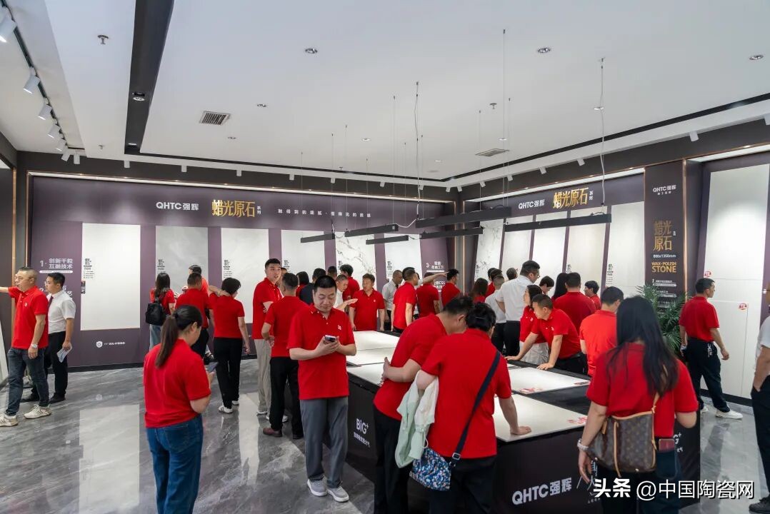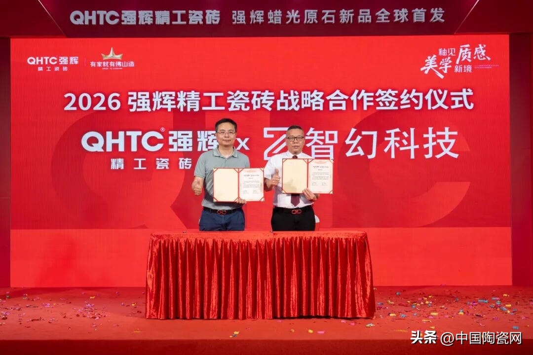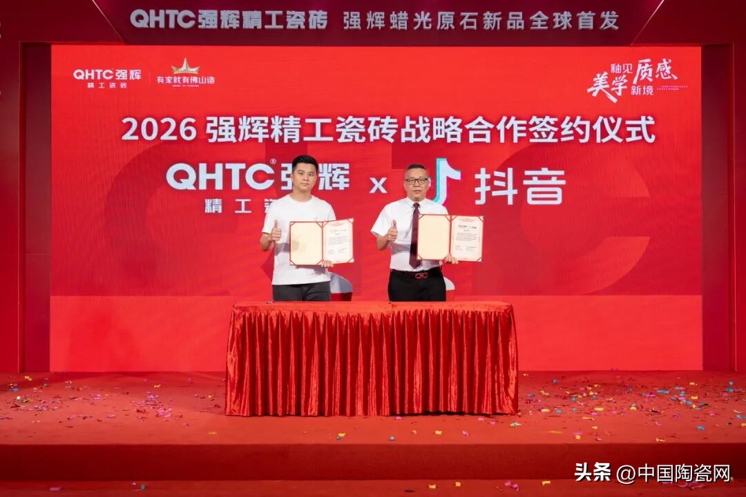 活动中,质感美学馆正式揭幕,空间融合自然纹理与现代设计,光影交织,诠释家居质感。蜡光原石系列新品全球首发,彰显品牌工艺创新与高端市场深耕的决心。强辉还与中国陶瓷网、抖音本地生活、智幻科技达成战略合作,共启发展新程。
