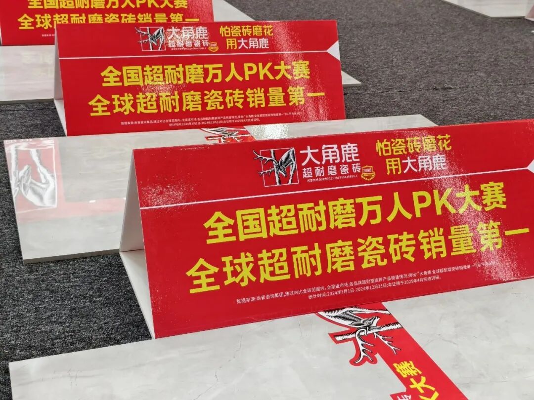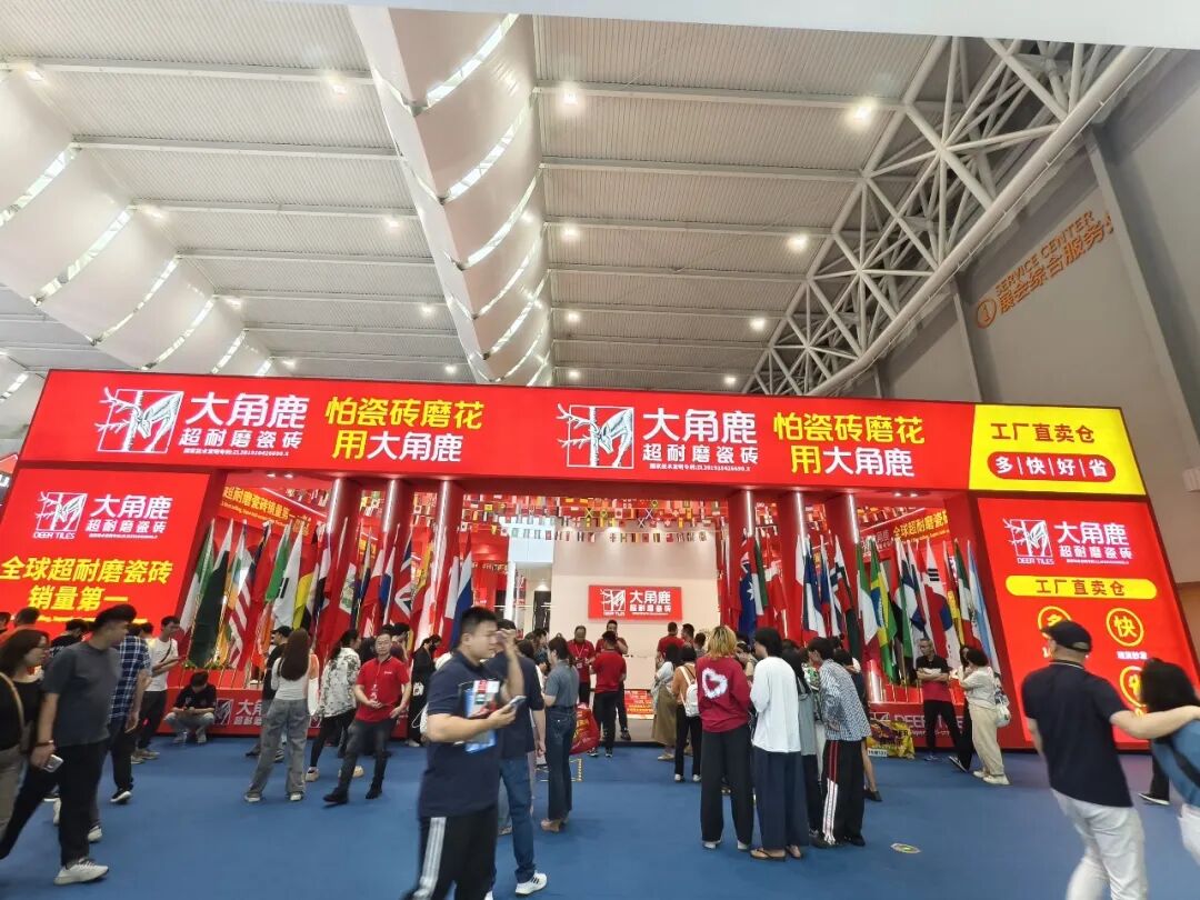 展位外立面,“全球超耐磨瓷砖销量第一”“工厂直卖仓 多快好省”的标识异常醒目。此次展会期间,大角鹿继续举办超耐磨万人PK大赛,吸引众多观众踊跃参加。