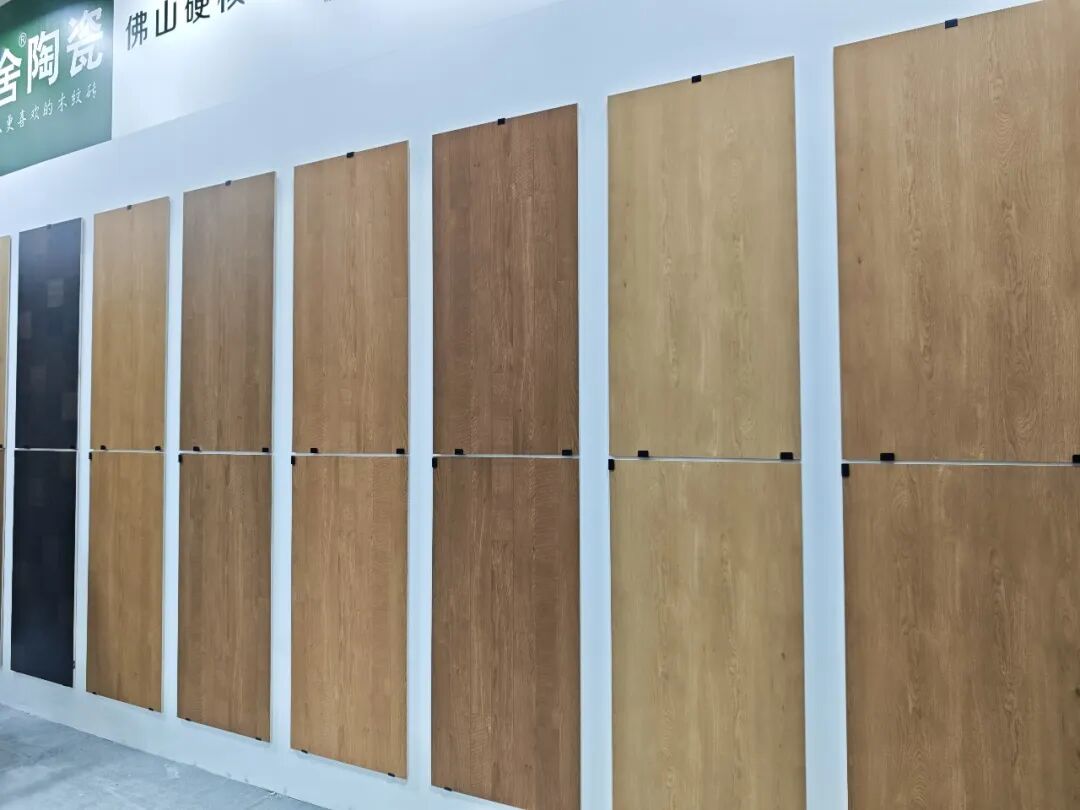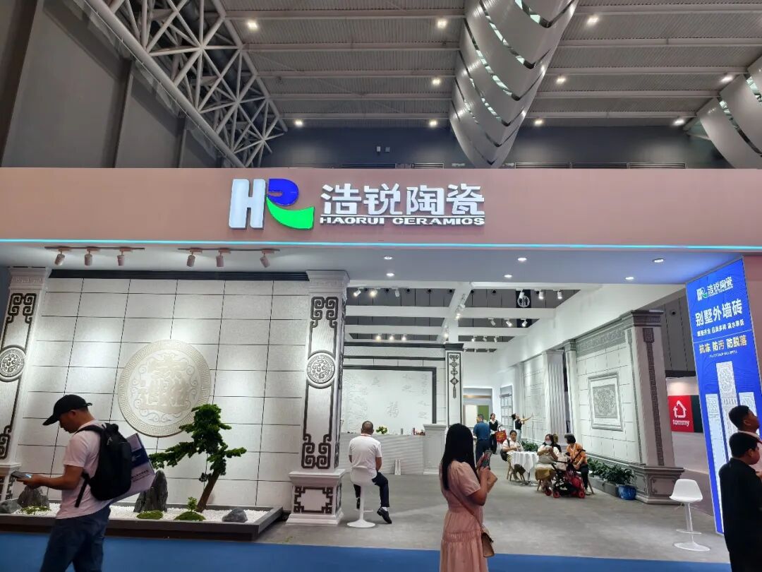 这是浩锐首次参加佛山潭洲陶瓷展,现场展示其全规格陶瓷产品,包括别墅外墙砖、金丝绒、木纹砖、超平釉、超防污子母配套大理石等新品。