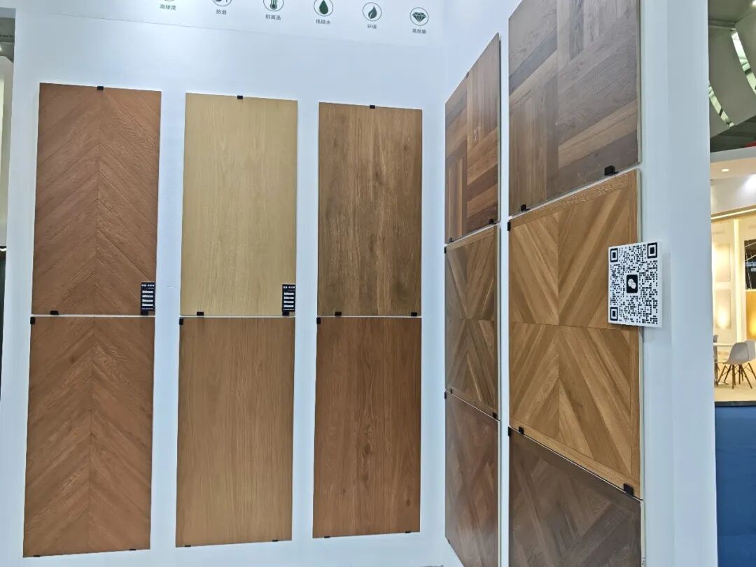 华硕主要展示了5A超洁金丝绒(白坯)系列和数码木纹家Ⅱ系列产品。5A超洁金丝绒采用45°超白底坯,将金丝绒的细腻温润与石材通透感结合,并坚守严苛5A级防污标准,具备超强防污、耐磨性能。数码木纹家Ⅱ则通过高精度数码模具及多重工艺,深度还原天然木材肌理,具备双零吸水率,耐磨抗造,花色选择多样。