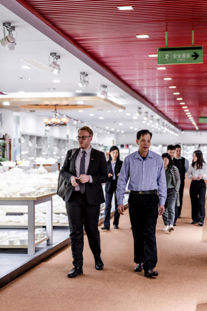 一行参观了公司的样品展示厅,在听完工作人员对于公司陶瓷产品的介绍后表现出了极大的兴趣,并且更加深入地了解到了日用陶瓷的制作工艺。