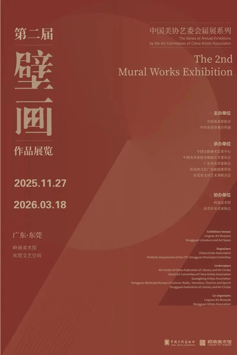 中国美协艺委会届展系列第二届壁画作品展由中国美术家协会、中共东莞市委宣传部主办,中国文联美术艺术中心、中国美术家协会壁画艺术委员会、广东省美术家协会、东莞市文化广电旅游体育局、东莞市文学艺术界联合会承办,岭南美术馆、东莞市美术家协会协办。